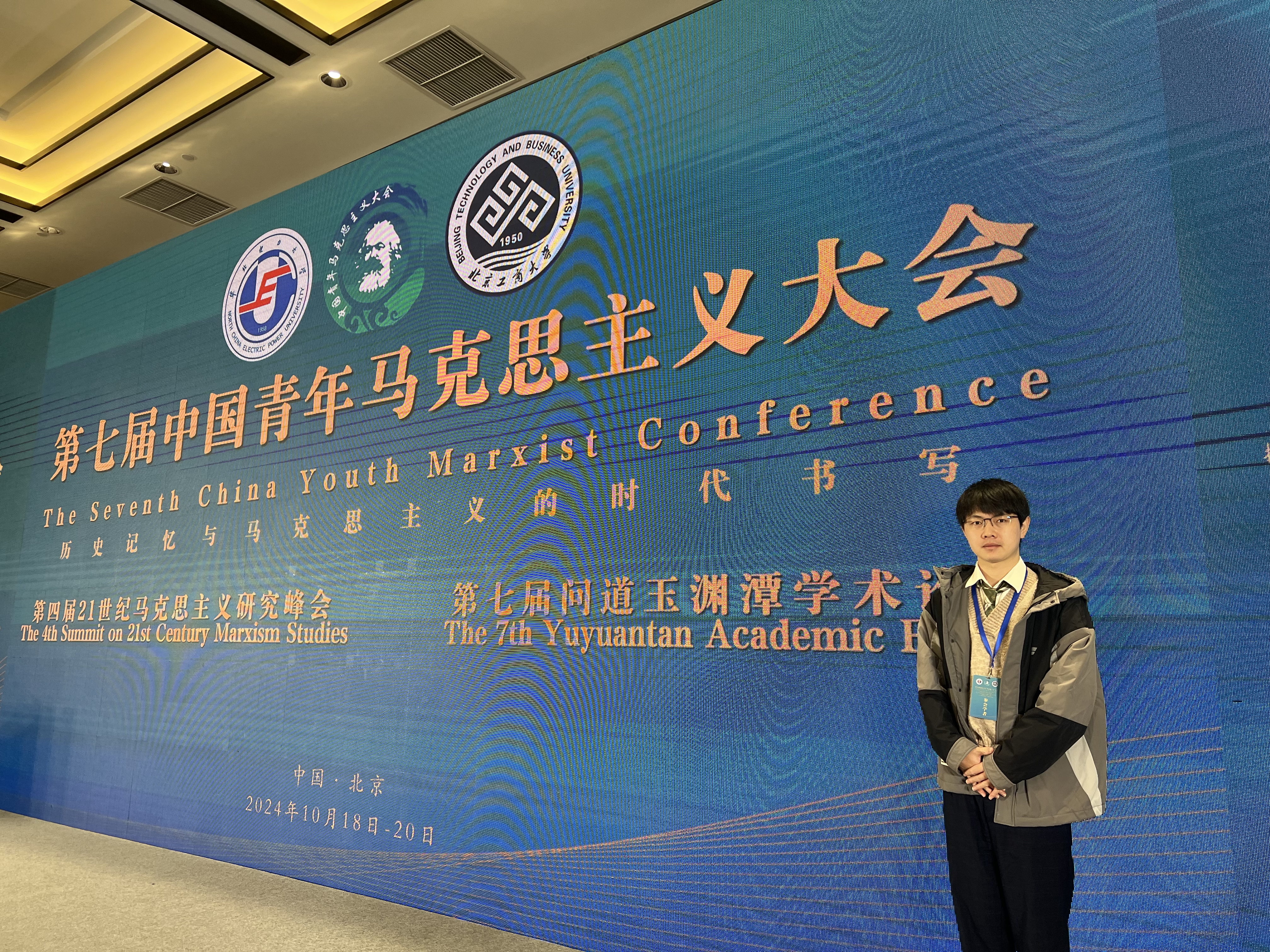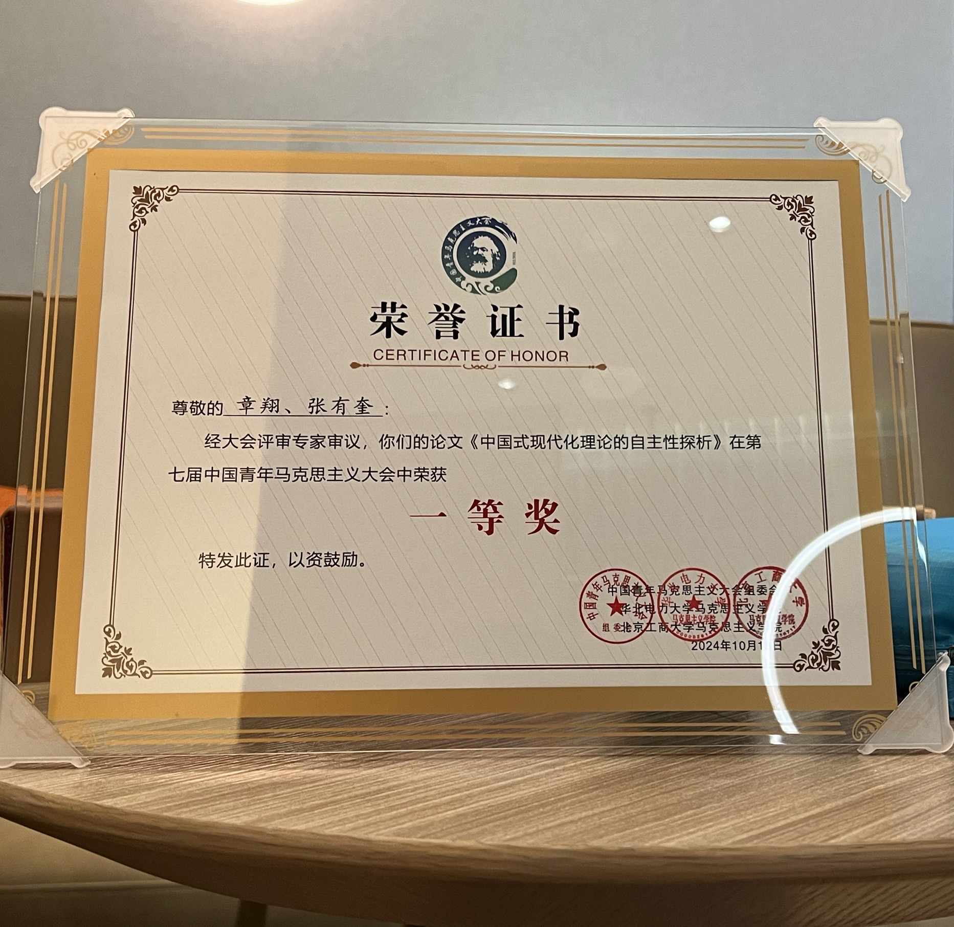 10月18日至10月20日,第七届中国青年马克思主义大会(暨第四届21世纪马克思主义研究峰会,第七届问道玉渊潭学术研讨会)在北京召开,我院2023级博士研究生章翔受邀参加大会的青年论坛·专题研讨分论坛,并作专题汇报。章翔提交的论文《中国式现代化理论的自主性探析》荣获一等奖(该文与我院张有奎教授合作完成)。