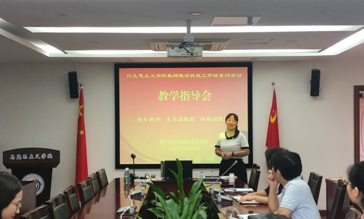为进一步提升教师教学技能, 10月15日上午,马克思主义学院在囊萤楼302会议室举行教学指导会。指导会邀请学校教学比赛工作委员会主任朱水涌教授,首届青年教师教学技能大赛“翻转课堂”一等奖获得者、数学科学学院杜妮副教授作为指导专家,为青年教师磨课。会议由学院副院长原宗丽主持,学院教师教学技能工作坊主任庄三红等参加磨课。