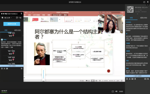 在第一堂课上,夏莹教授为大家介绍了重新阐释马克思主义的重要性,总结了卢卡奇重新阐释马克思主义的核心思想,其中重点讲解了卢卡奇的两个核心概念:总体性原则和物化理论,最后夏莹教授阐明了卢卡奇的物化问题的解决最终落脚到无产阶级身上。在第二堂课上,夏莹教授为大家介绍了法兰克福学派的代表人物与主要研究内容,讲授了文化工业批判的路径和方法,着重讲解了鲍德里亚的符号政治学批判以及后期媒介批判理论。在第三堂课上,夏莹教授为大家介绍了马克思对法国当代哲学家的影响,她点明了人道主义马克思主义与结构主义马克思主义的共同起源,并重点介绍了萨特的现象学,阿尔都塞的症候阅读法、多元决定论以及偶然相遇的唯物主义理论,从中引申出历史唯物主义的时代内涵。在第四堂课上,夏莹教授为大家讲解了本雅明的《历史哲学论纲》中的事件思想,论述了本雅明的事件本质,并将其与巴迪欧的事件理论相链接。在第五堂课上,夏莹教授将全球疫情与生命政治相链接,主要提出了福柯对生命政治的讨论、奈格里与哈特的生命政治取向以及阿甘本的生命政治取向。通过五个专题的讲授,夏莹教授将西方马克思主义的一些重要学者与核心思想进行了创新性解读,帮助师生更好地理解当代西方马克思主义。夏莹教授还利用每次课的后半段时间为同学们答疑解惑,与同学们进行交流互动。师生们也纷纷在网络平台留言,表示此次教学活动收获丰硕,大家进一步深化了对当代西方马克思主义前沿和理论的认识。