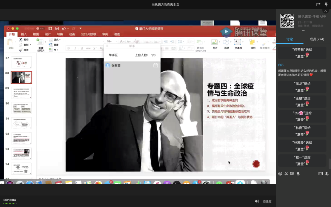 在最后一堂课上,我院常务副院长张有奎教授对夏莹教授的课程做出了总结性发言。他感谢夏莹教授克服困难,为同学们作出精彩讲解,同时希望同学们可以通过这次课程,更好地了解和把握当代西方马克思主义。