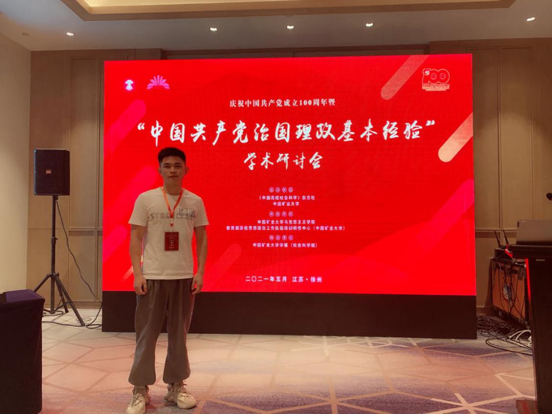 为庆祝中国共产党成立100周年,总结中国共产党治国理政的理论与实践探索经验,5月22日, “中国共产党治国理政基本经验”学术研讨会在中国矿业大学举行,我院2020级硕士研究生连传钊同学受邀参加本次研讨会。