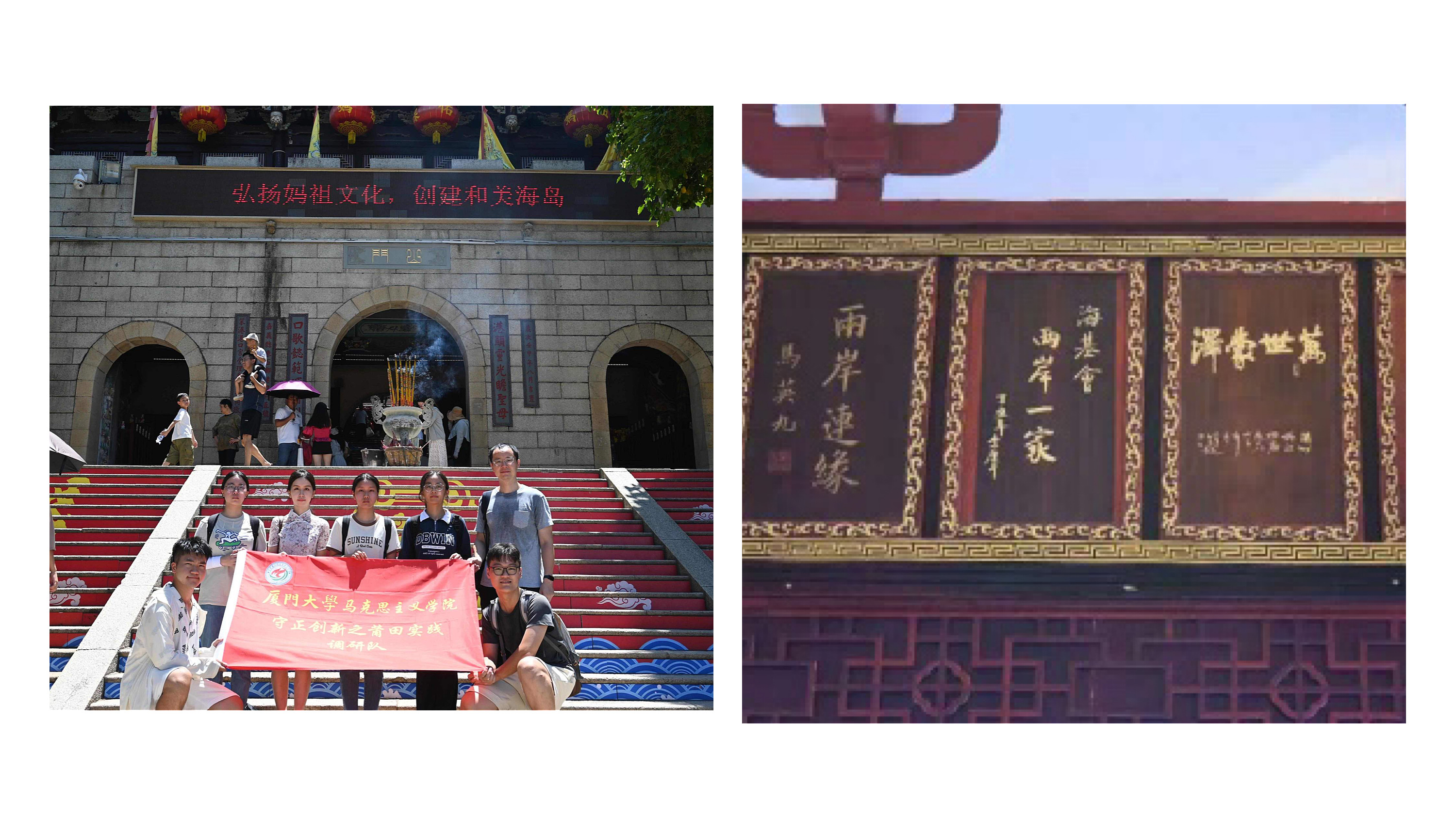 7月16日,团队成员乘船前往湄洲岛领略妈祖文化。天下妈祖,祖在湄洲,湄洲岛妈祖庙是妈祖文化的发祥地和核心区。在妈祖庙,团队成员了解到“海上和平女神”妈祖乐善好施,救助海难羽化升天的动人故事,感受到妈祖文化深厚的文化底蕴,为妈祖“立德、行善、大爱”的精神所动容。“神昭海表”的文化牌匾,是人民对“天后”的无上信仰。妈祖文化是海外华侨华人联系彼此的重要精神纽带,妈祖信俗更成为中国首个信俗类世界遗产。世界妈祖文化论坛每年的举办,为妈祖文化研究交流提供一个多元、开放、包容的平台,助力妈祖文化在世界范围内的传播与发展。