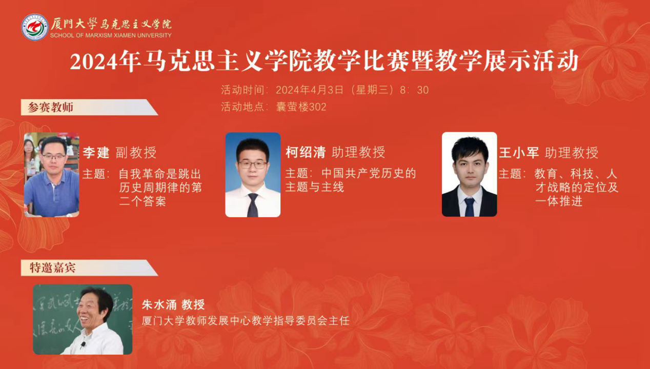 比赛伊始,马克思主义学院党委书记石红梅介绍了三位参赛教师,她指出,青年教师是思政课教学的重要组成力量,希望此次比赛能够提高思政课教师的教学水平,展示出厦大马院的精神面貌和青春活力。