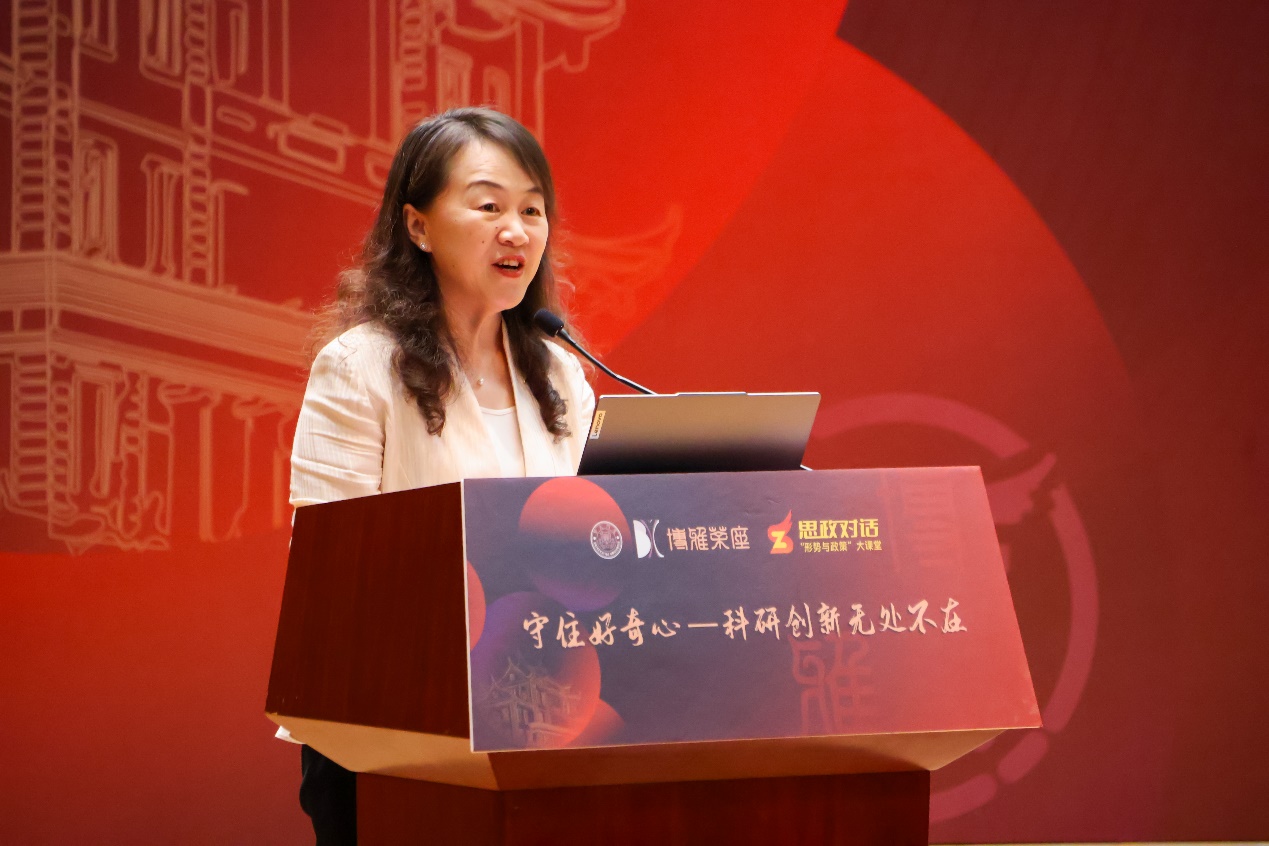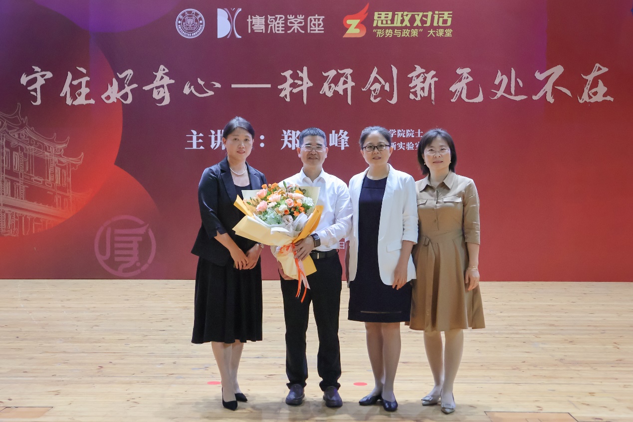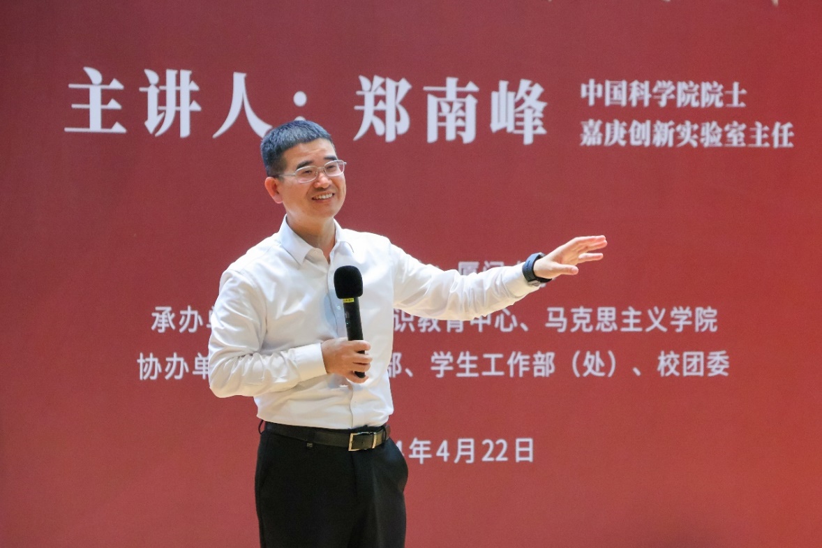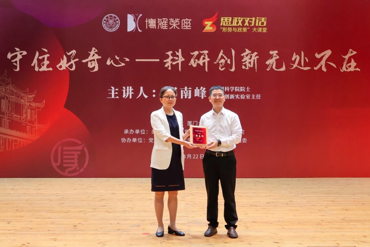 4月22日下午,“思政对话”形势与政策大课堂在厦门大学思明校区科学艺术中心音乐厅举行。中国科学院院士、嘉庚创新实验室主任郑南峰院士应邀作“守住好奇心——科研创新无处不在”主题讲座,马克思主义学院副院长原宗丽教授主持。校党委宣传部、学生工作部(处)、校团委、美育与通识教育中心、马克思主义学院等单位相关负责人、“形势与政策”大课堂的任课老师及线上线下近16000名学生共同参与交流。