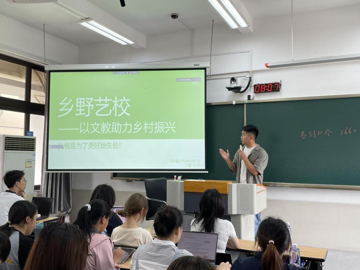 毛华磊以《乡野艺校——以文教助力乡村振兴》为题,介绍了他在屏南创办“乡野艺校”的思考与实践。“乡野艺校”扎根于屏南县南部的前汾溪村,毛华磊和他的伙伴们本着“扎根是为了更好地生长”理念,长期驻扎乡村,将乡野作为学习场域,以美育激发人们创造力。乡野艺校发起“1000个美育计划” ,从当地民俗文化、社群记忆、居住空间、产业现状和持续发展需求出发,结合学生实践、院校合作、艺术家驻留等多种方式,共同营造一个充满生活力的社群环境。在当地社区村民的支持、母校与各级政府的关怀、国内外各领域专家的指导和帮助以及全国各地志愿者的协力下,毛华磊带领的乡野艺校开发了《乡村美育课堂》《今晚吃什么?》《节日快乐》《生态产业1+N》《美丽家园生长计划》等多个项目,成效显著。毛华磊还和同学们分享了其他多位在屏青年参与乡村振兴的故事,展现了青年群体在推进乡村文化振兴过程中贡献的青春力量的生动图景。