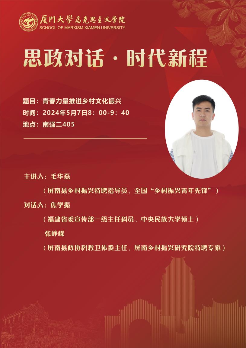 5月7日上午,全国“乡村振兴青年先锋”、福建省宁德市屏南县乡村振兴特聘指导员毛华磊老师受邀走进厦门大学马克思主义学院《习近平新时代中国特色社会主义思想概论》课堂,以“青春力量推进乡村文化振兴”为主题,与同学们进行了一场精彩而富有韵味的“思政对话”。福建省委文明办一级主任科员焦学振博士、屏南县政协科教卫体委主任、屏南乡村振兴研究院特聘专家张峥嵘则线上参与了本次“思政对话”。“对话”由马克思主义学院习近平新时代中国特色社会主义思想概论教研部副主任黄佳佳副教授主持。