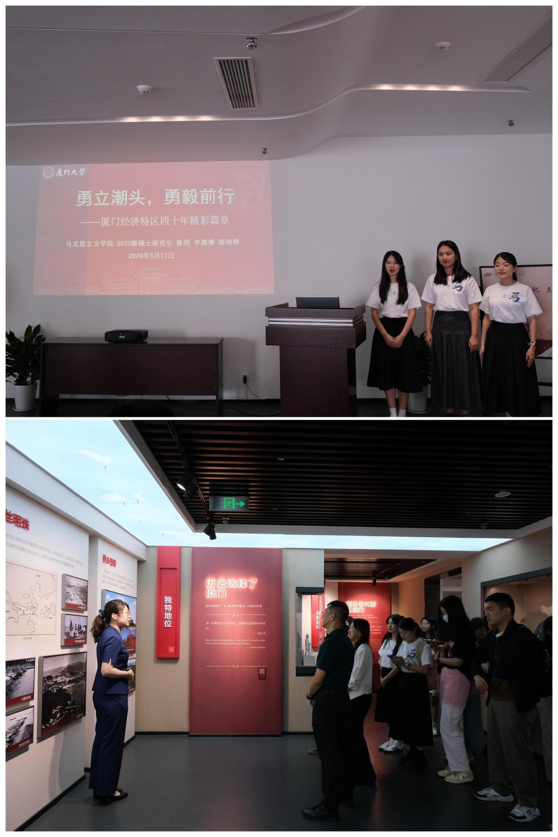 厦门大学马克思主义学院学生代表鲁玥、李漪琳和陈艳婷“趁热打铁”,在签约暨揭牌仪式后进行了“勇立潮头,展翅扬帆——厦门经济特区四十年精彩华章”主题宣讲,从经济、生态、文化这三个方面为大家讲述厦门经济特区的故事。随后,由厦门经济特区纪念馆的讲解员带领大家参观“厦门经济特区开创阶段”“厦门经济特区发展阶段”“习近平总书记在厦门”等主题展览,感受厦门从一座滨海小城走向经济特区的发展历程。