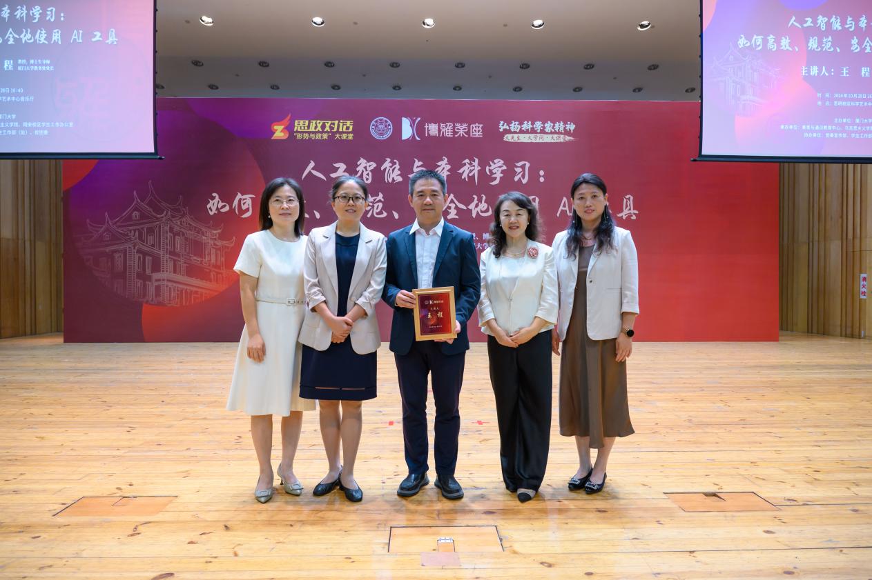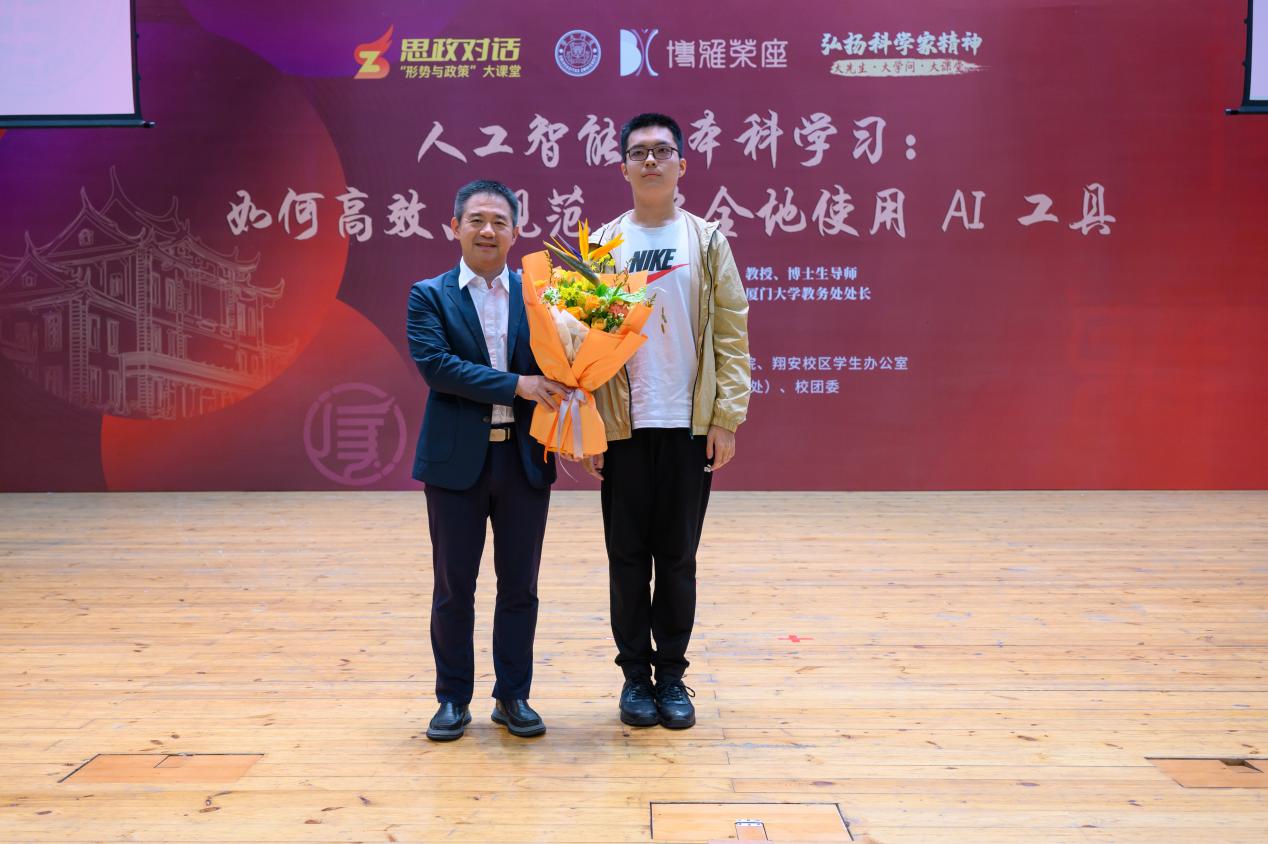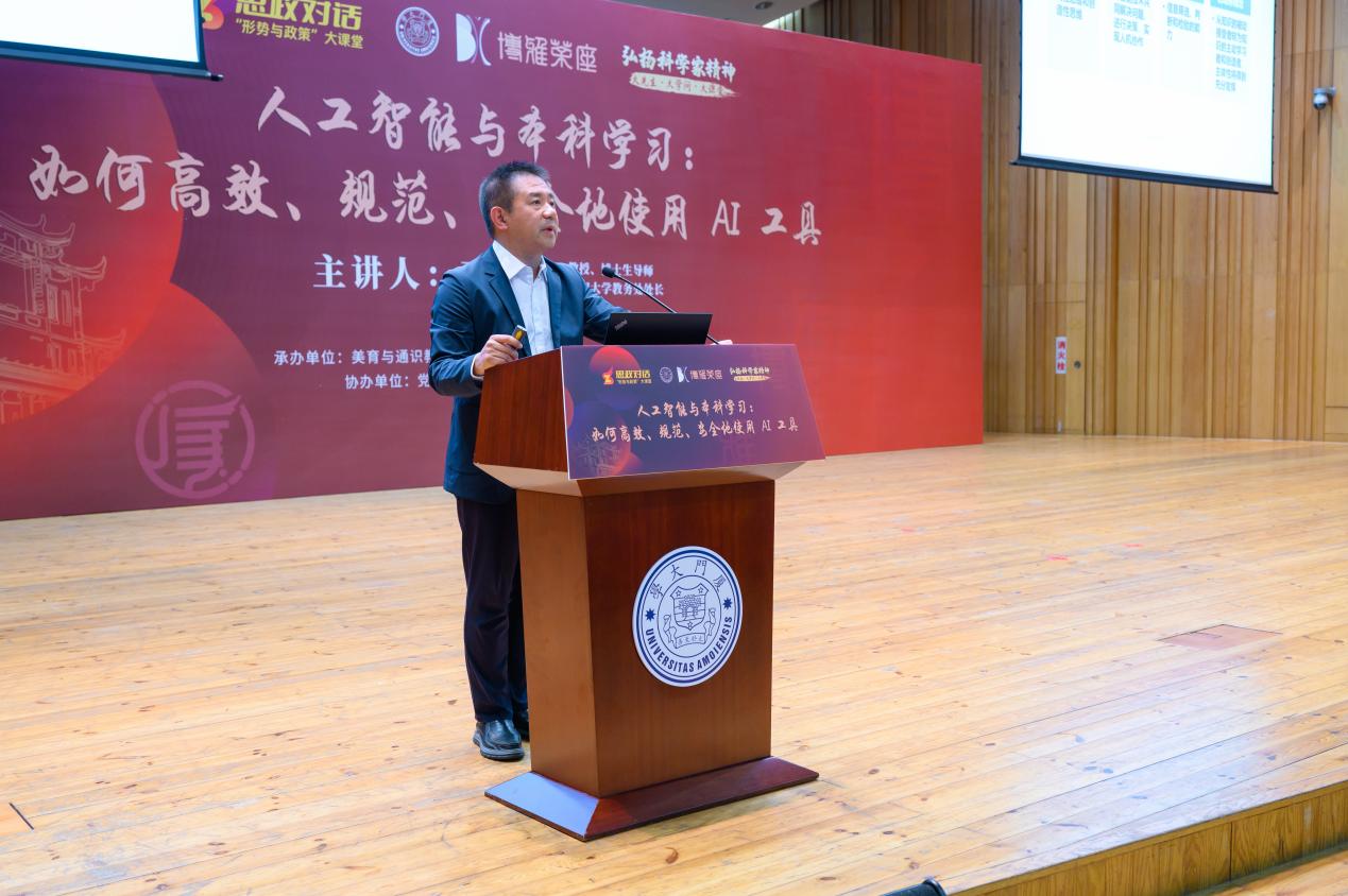 2024年10月28日,“博雅茶座”暨“思政对话”形势与政策大课堂、弘扬科学家精神大思政课活动在厦门大学思明校区科艺中心音乐厅举行。厦门大学教务处处长、现代教育技术与实践训练中心主任王程教授应邀作“人工智能与本科学习:如何高效、规范、安全地使用AI工具”的主题讲座,马克思主义学院副院长原宗丽教授主持。厦门大学美育与通识教育中心、学生工作部(处)、马克思主义学院的领导和老师及线上线下一万余名学生共同参与交流。