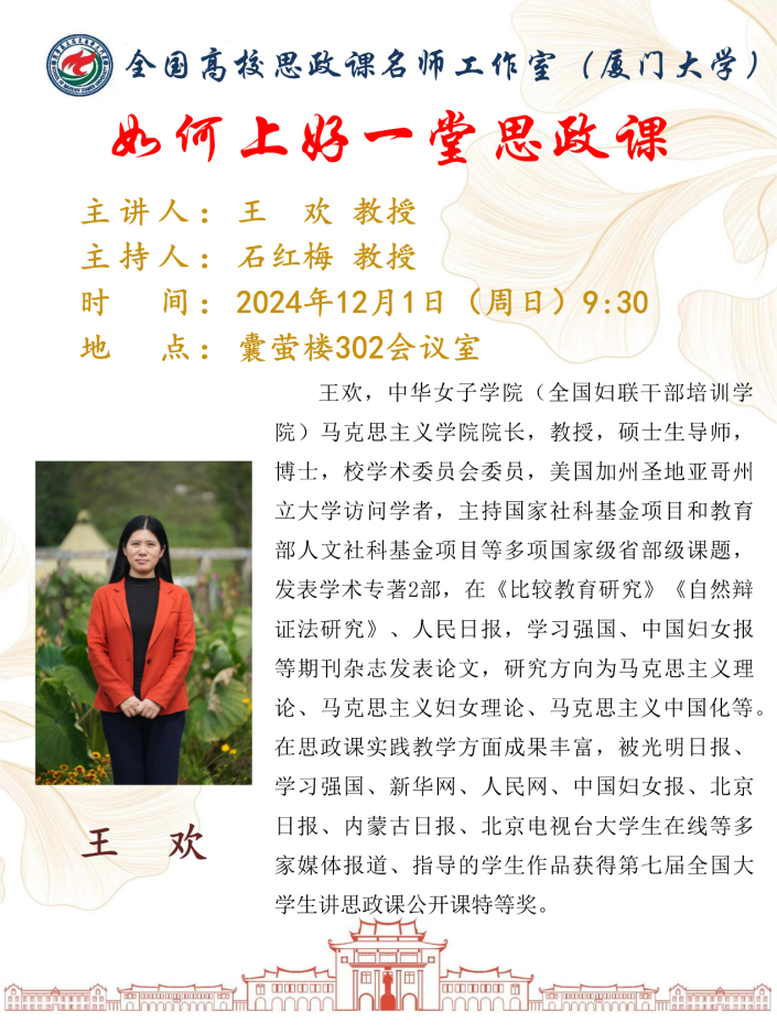 2024年12月1日上午,中华女子学院(全国妇联干部培训学院)马克思主义学院院长王欢教授应邀来到厦大马院,在囊萤楼302会议室作题为“如何上好一堂思政课”的主题讲座。全国高校思政课名师工作室(厦门大学)负责人、厦门大学马克思主义学院党委书记石红梅教授主持此次会议。名师工作室成员及厦大马院研究生代表参与讲座。