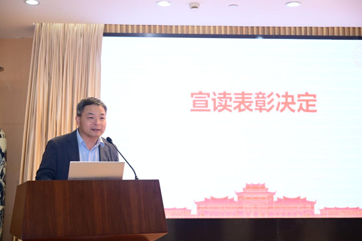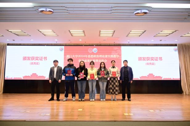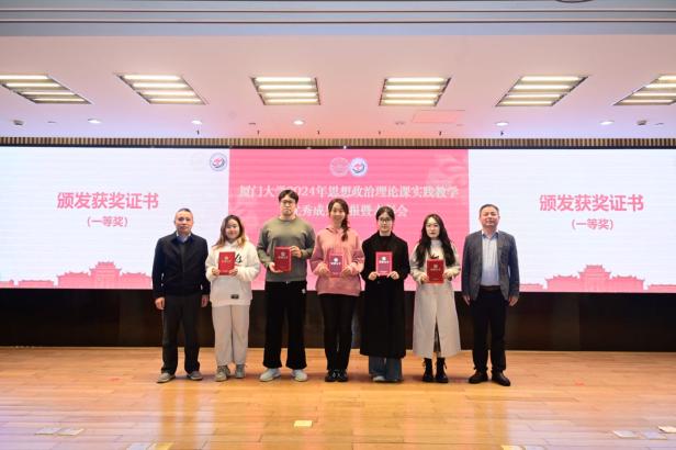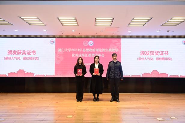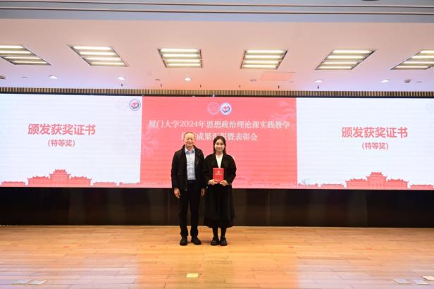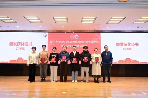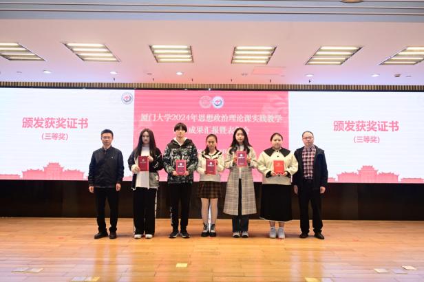 接下来,教务处副处长何海涛宣读《关于表彰2024年厦门大学思想政治理论课实践教学优秀成果、优秀指导教师的决定》,对优秀调研成果和优秀指导教师进行表彰。本次共评选出177个优秀成果奖,其中一等奖20个,二等奖39个,三等奖56个,优秀奖62个,史勤等24名老师获“优秀指导教师”荣誉称号。此外,通过现场评选,另选出特等奖1个,最佳人气奖1个,最佳展示奖1个。孙理副书记、徐进功院长及其他参会领导为获奖师生颁发获奖证书。