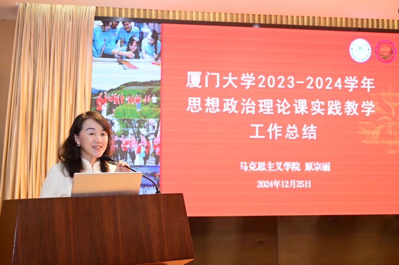 马克思主义学院副院长原宗丽对2023-2024学年思想政治理论课实践教学工作进行总结。她强调,厦门大学思想政治理论课实践教学工作不断深入推进,取得了明显的育人效果,在学校落实立德树人根本任务、培养新时代中国特色社会主义事业建设者和接班人的工作中发挥了重要作用。她提出在下一阶段要加强实践教学的顶层设计、增强实践教学的高阶性和创新性、深化实践与课堂的双向促动、提高思政课实践教学特色和影响力以攻克思政课实践教学的痛点难点,进一步为厦门大学高质量人才培育贡献力量。