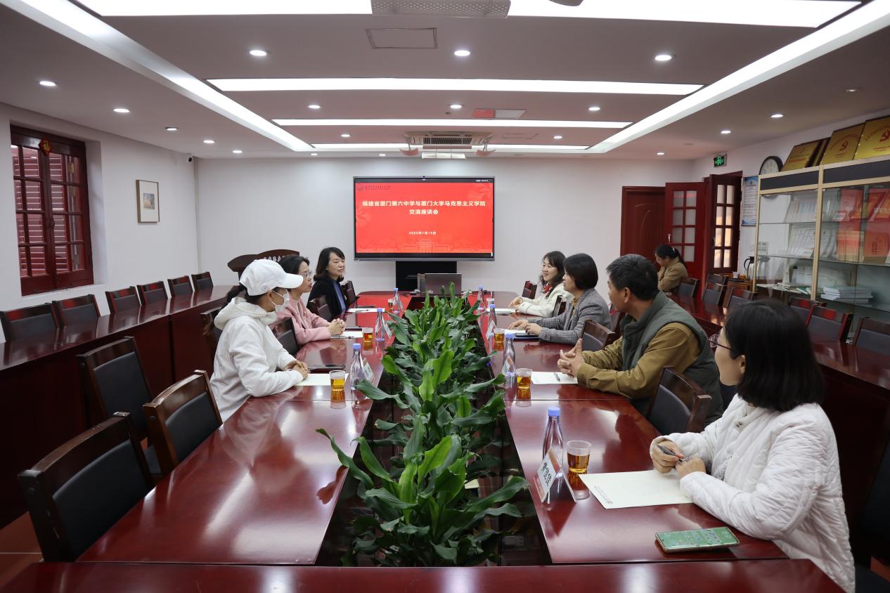 为深入学习贯彻落实习近平总书记对学校思政课建设作出的重要指示精神,推动福建省大中小学思政课一体化建设,2025年1月15日,福建省厦门第六中学与厦门大学马克思主义学院于囊萤楼302会议室开展大中小学思政课一体化建设座谈会,就学校思政课品牌建设进行深入的交流。厦门第六中学校长吴丹玲、副校长陈紫燕、艺术团团长陈琦,厦门大学马克思主义学院党委书记石红梅、党委副书记刘晓峰、副院长原宗丽、习近平新时代中国特色社会主义思想概论教研部副主任黄佳佳等出席此次座谈会。