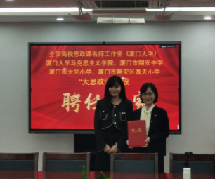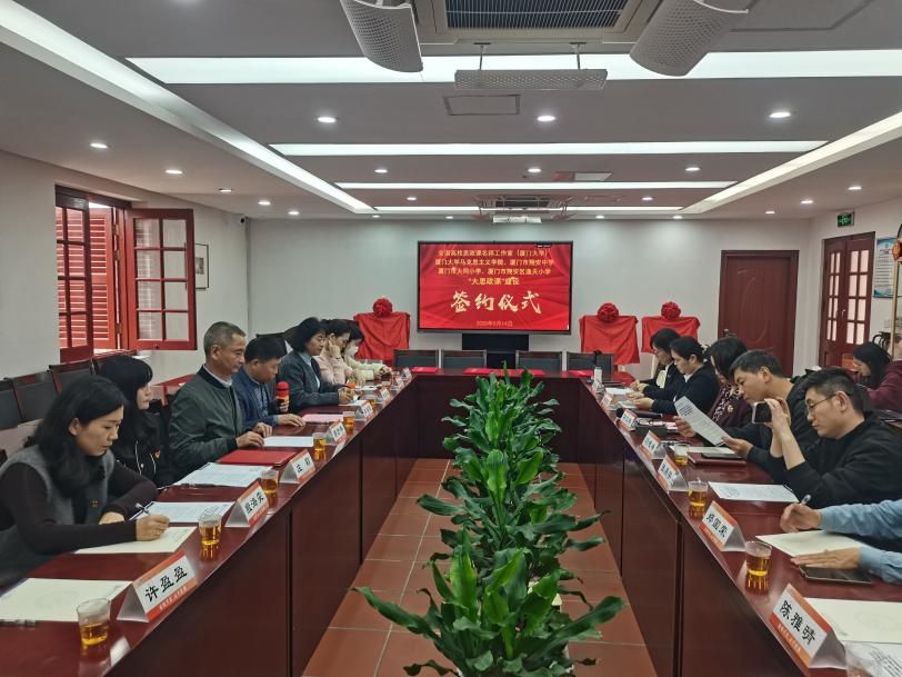 在习近平总书记“3·18”讲话六周年即将到来之际,为进一步深化合作,推动大中 小学思政课 一体化建设改革 创新, 3月14日 ,全国高校思政课名师工作室(厦门大学)、厦门大学马克思主义学院、厦门市翔安中学、厦门市大同小学和厦门市翔安区逸夫小学“大思政课”建设签约仪式 在 厦门大学囊萤楼 302 会议室 举行 。 厦门大学马克思主义学院党委书记 石 红梅、党委副书记刘晓峰、 各 教研部 (室) 教学主任 代表;厦门市翔安中学副校长、厦门市翔安区思政课一体化研究中心主任李圣德;厦门市 翔安区逸夫小学书记、校 长 施彩虹 ,副校长郭诗云;厦门市大同小学 书记郭 方 年 、校长庄莉、德育主任许盈盈、德育干事蔡铭等出席此次会议 。 会议由李圣德主持, 参与此次签约仪式的还有来自四所院校的教师与学生代表们。
