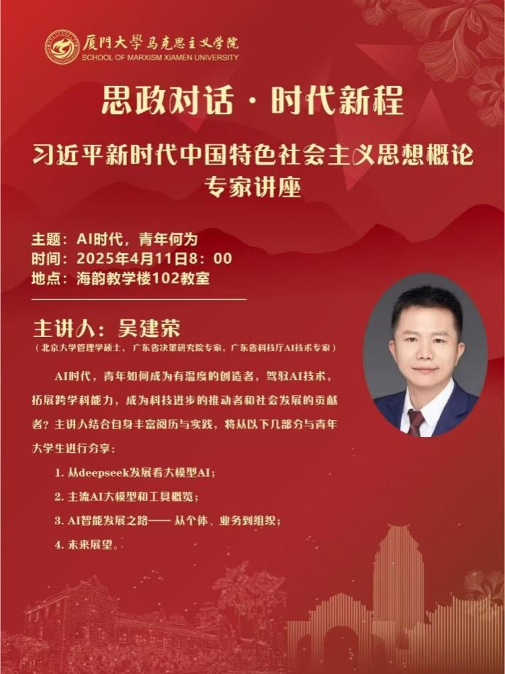 2025年4 月11日上午,《习近平新时代中国特色社会主义思想概论》课程邀请厦门大学1996级校友、广东省决策研究院专家、广东省科技厅AI技术专家吴建荣走进课堂,为同学们带来一场题为《新时代的必修课——拥抱 AI大航海》的精彩讲座。