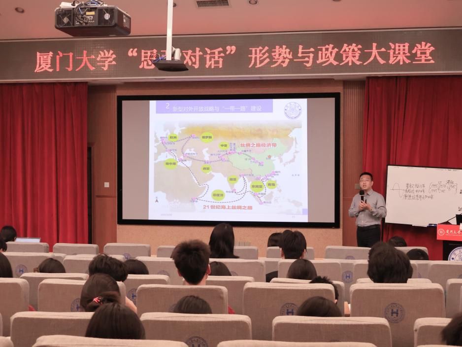 2025年4月28日,“思政对话”形势与政策大课堂在厦门大学思明校区化学报告厅举行。本次活动邀请到厦门大学金融系蔡伟毅教授,带来题为“新型对外开放战略与中国企业‘走出去’”的精彩讲座。讲座由厦门大学学生工作部(处)副部(处)长陈国全主持,厦门大学学生工作部(处)、马克思主义学院的领导和老师,以及线上线下近万名学生共同参与交流。