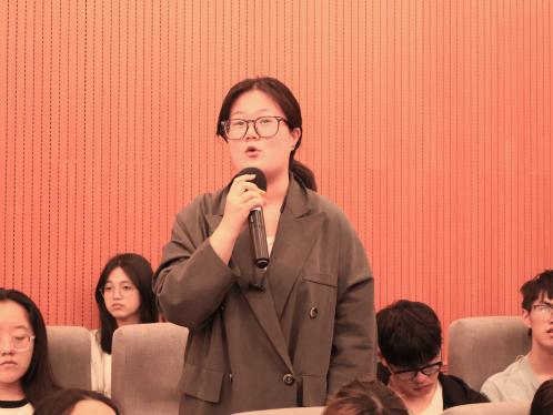 在互动环节,现场气氛活跃,同学们积极提问并与蔡伟毅展开热烈交流。蔡伟毅充分肯定了同学们对中国企业如何应对贸易摩擦进行的积极思考,并建议大家因势而谋、应势而动,增强解决现实难题的信心与能力。面对人工智能带来的机遇与挑战,他指出,大数据与人工智能领域未来发展潜力巨大。他也勉励同学们要巩固自身专业优势,积极拓宽学科视野,广泛涉猎多领域的知识,努力成长为跨学科复合型人才。