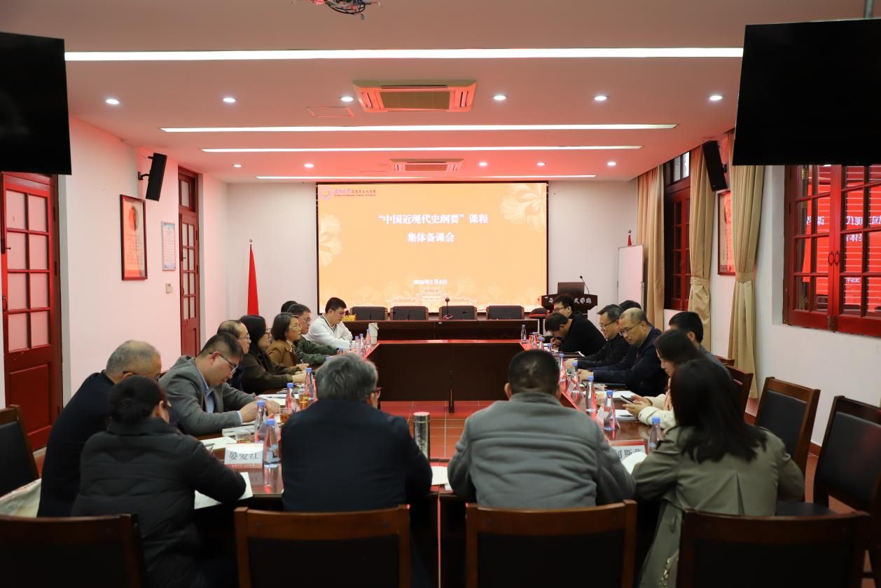 为深入贯彻落实习近平总书记关于学校思政课建设的重要指示精神,推动思政课建设内涵式高质量发展,2026年1月4日下午,马克思主义学院在囊萤楼216报告厅召开“中国近现代史纲要”课程集体备课会。校党委书记,中国科学院院士张荣、校党委常务副书记林东伟、校党委原副书记,马克思主义学院院长徐进功、常务副院长张有奎、副院长原宗丽、副院长刘皓琰、党委副书记刘晓峰,以及“中国近现代史纲要”课程组全体教师出席会议。会议由徐进功主持。