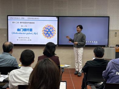 教学展示环节,王凯立、刘玲、梁青三位教师结合课程特色,依次进行了20分钟的教学展示。王凯立围绕《伦理学》课程中的“对规则主义的反思”专题,结合具体案例阐释了规则主义的核心内涵。刘玲以《习近平新时代中国特色社会主义思想概论?》课程中“正确理解全人类共同价值”内容为主题,通过对比西方普世价值,系统阐述了全人类共同价值的内涵。梁青基于《感染与免疫2》课程,就“幽门螺旋杆菌”为专题,对其结构、致病机制与免疫应答进行了讲解。