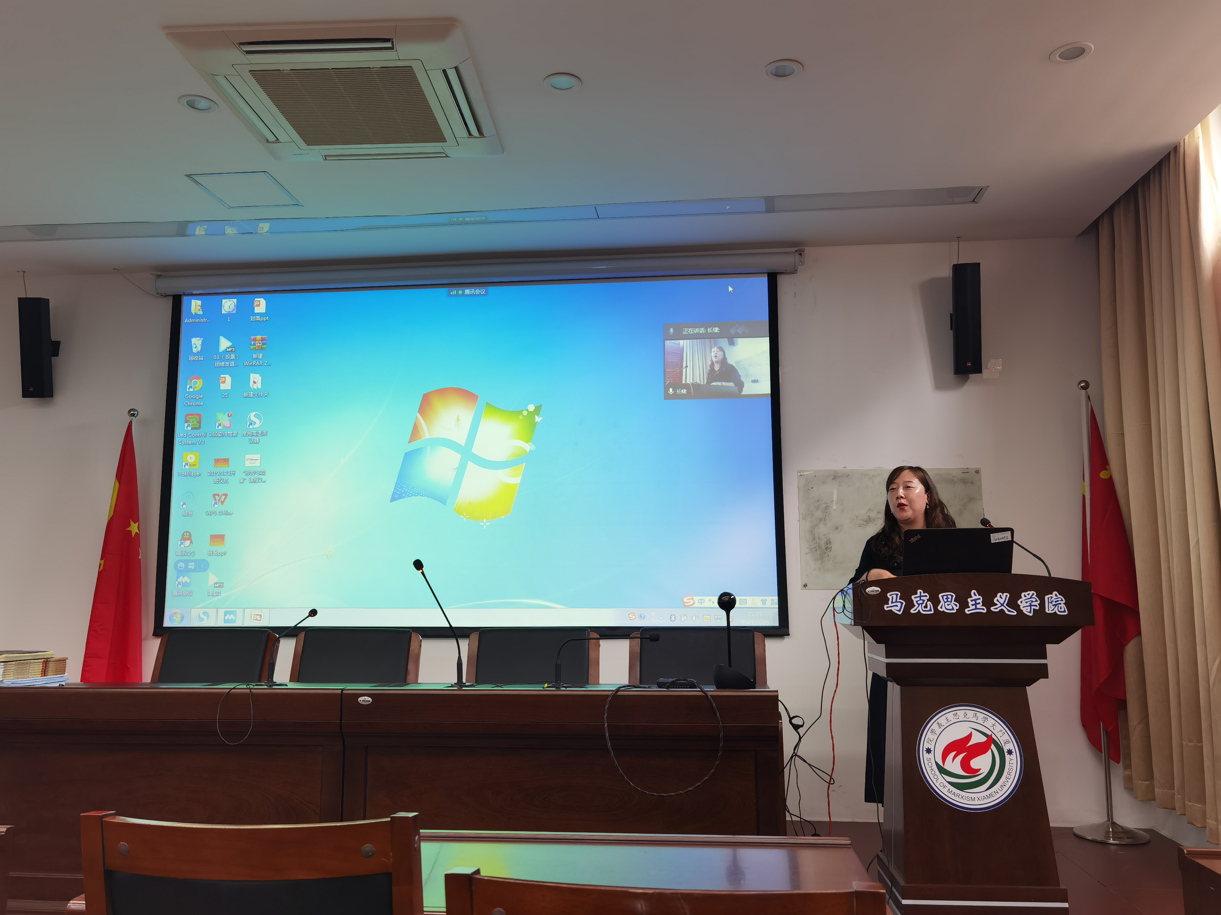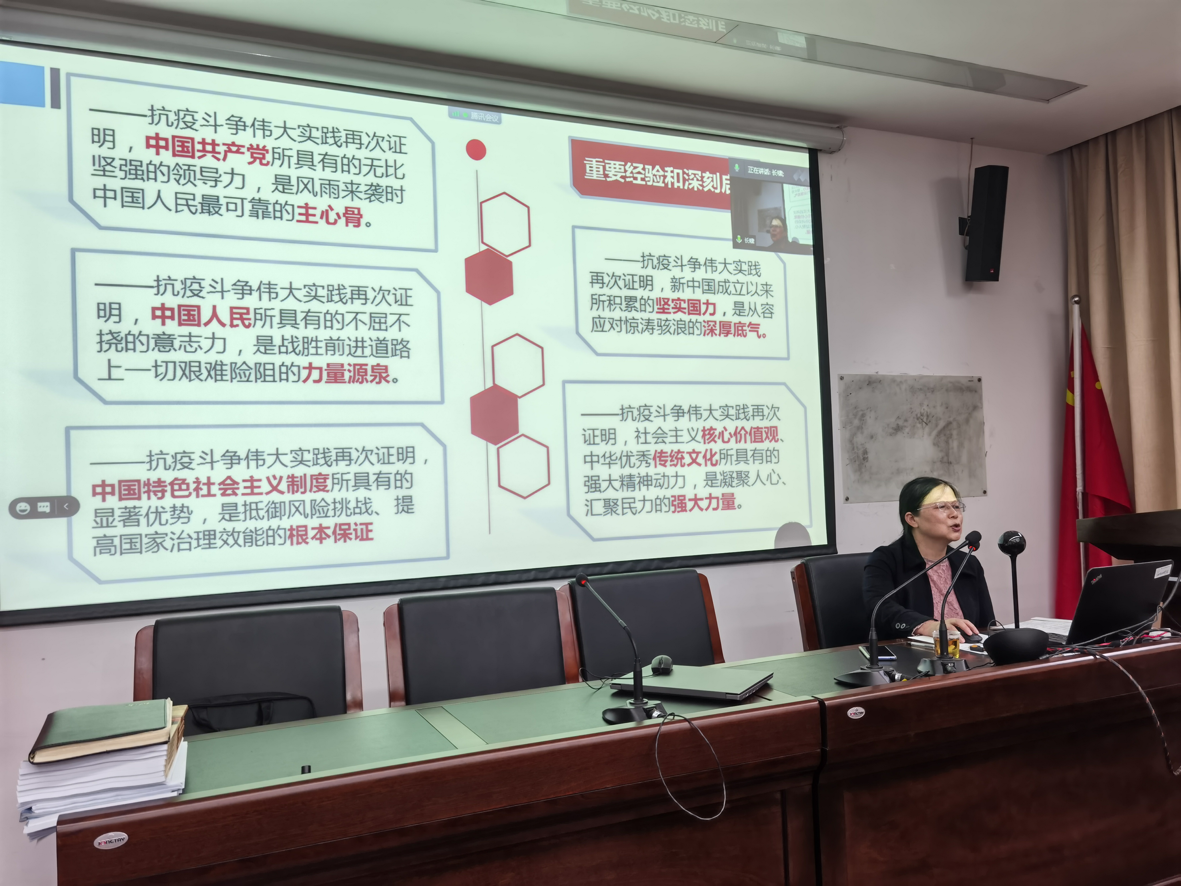 袁华对如何在“形势与政策”课程专题教学中贯彻十九届五中全会精神进行具体指导,她从中国共产党为什么能等七个专题出发,认真详实地为各位老师介绍了课程内容和要求,并针对《绘就新蓝图奋进新征程》主题进行了专题分享。