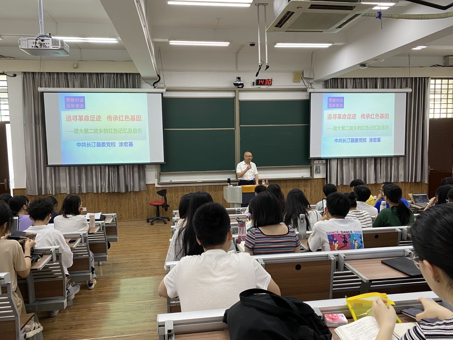 2021年5月25日下午,“思政对话、百年史光”系列活动之一在南强二403、401教室进行。中共长汀县委党校常务副校长涂宏基走进“马克思主义基本原理概论”课堂,讲授“厦大第二故乡长汀的红色故事”。讲座由马克思主义学院副院长张艳涛教授主持。