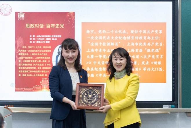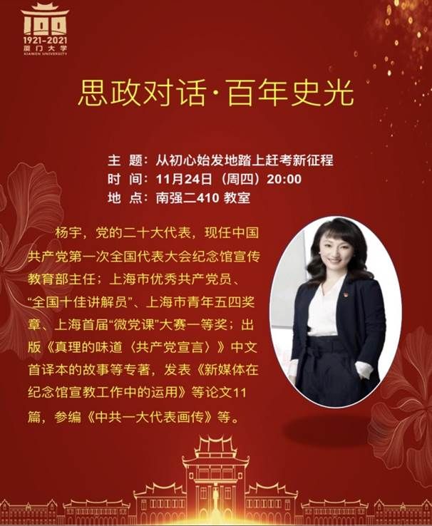 11月24日晚,在厦门大学马克思主义学院原宗丽教授主讲的“习近平新时代中国特色社会主义思想概论”思政课堂上,邀请了党的二十大代表、中共一大纪念馆宣传教育部主任杨宇给同学们上了一堂特别的红色传承思政课。