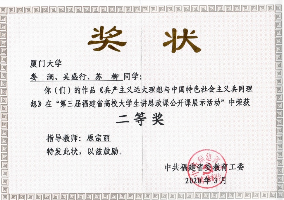近期,在中共福建省委教育工委组织开展的“习近平新时代中国特色社会主义思想大学习领航计划系列主题活动中,由我院原宗丽老师悉心指导、2018级博士研究生娄澜等展示的作品《共产主义远大理想与中国特色社会主义共同理想》喜获“砥砺前行七十载·奋斗成就中国梦”——第三届福建省高校大学生讲思政课公开课展示活动二等奖。