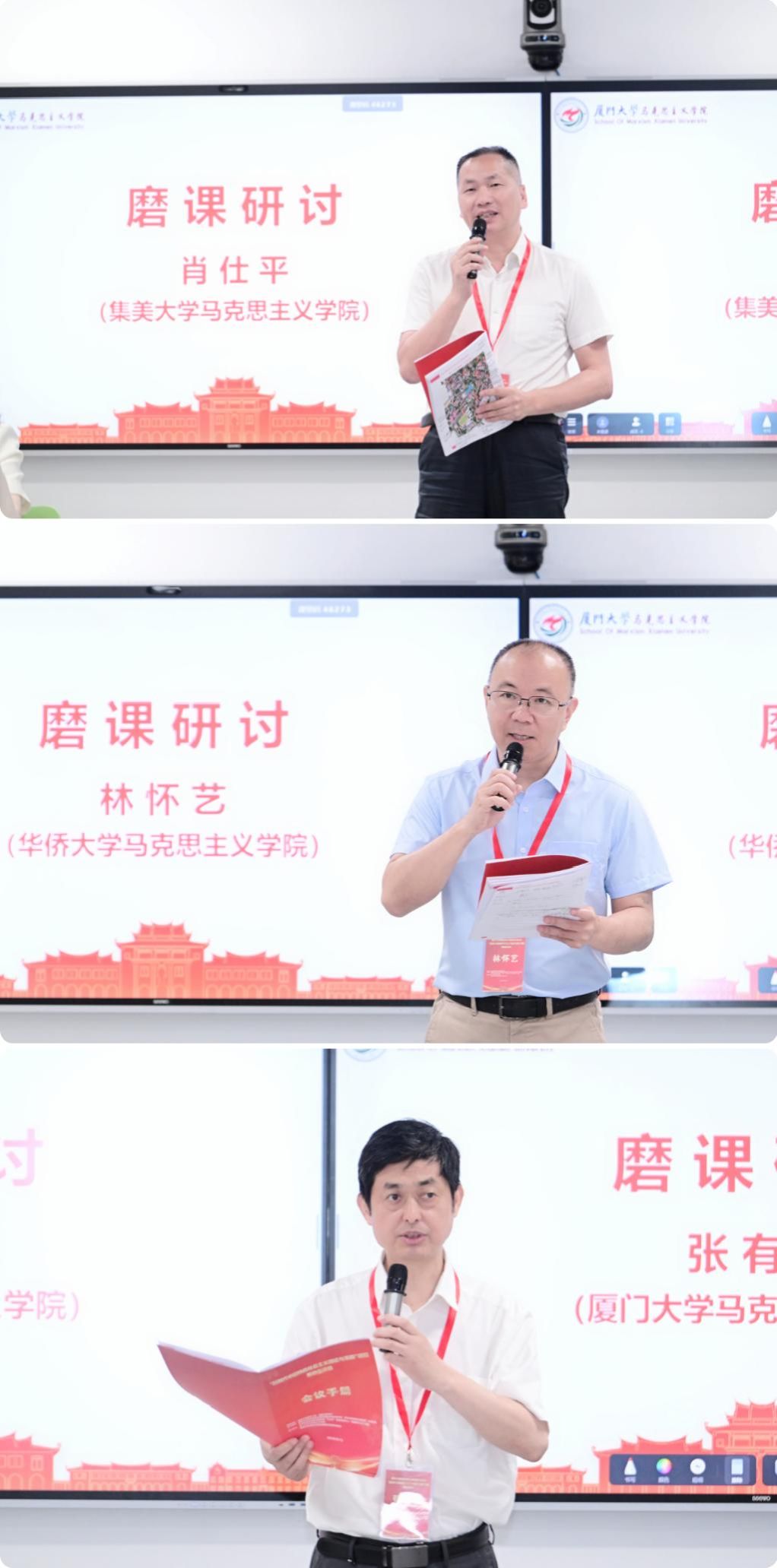 随后,三位福建省高校思想政治理论课教学指导委员会“研究生思想政治理论课”分教指委委员:集美大学马克思主义学院教授肖仕平、华侨大学马克思主义学院教授林怀艺、厦门大学马克思主义学院张有奎作为指导专家为说课教师做出点评,开展磨课研讨。肖仕平指出,三位说课老师态度用心、内容详实、技巧丰富、案例鲜活,并对他们的说课内容分别提出针对性建议。林怀艺认为,三位老师的说课展示不仅体现了思政课“讲道理”的本质,有利于理论联系实际,引导学生树立挺膺担当的自觉,更反映了思政课铸魂育人、立德树人的重要作用。张有奎指出,要把道理讲得有政治高度、理论深度与情感温度。他提出了关于改进思政课教学的四点建议:一是将习近平总书记在福建17年半的故事融入思政课堂,讲好中国式现代化的福建篇章;二是注重研究生思政课程内容深度的挖掘;三是推进数字思政建设,将数字技术更好融入思政教学;四是教学中注重情感的融入,在情理交融中实现情感认同。