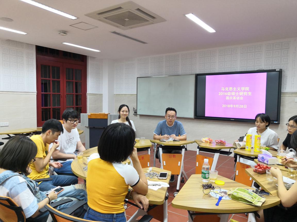 在我院2018-2019学年全院师生大会精神的指导下,在庆祝伟大祖国69华诞来临之际,我院2016级硕士研究生班于9月28日晚七点在囊萤楼105举办了以2016级硕士研究生考博与就业问题为主题的国庆茶话会。出席本次茶话会的有2016级研究生班班主任贾凯老师及2016级全体学生。