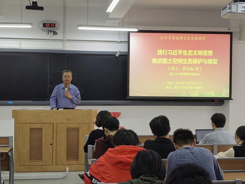 11月18日上午,厦门市自然资源和规划局一级调研员洪荣标博士走进研究生思政课《中国马克思主义与当代》课堂,为我校人文学院、信息学院博士研究生作了题为“践行习近平生态文明思想 推进国土空间生态保护与修复”的专题讲座。此次讲座由马克思主义学院石红梅教授主持。