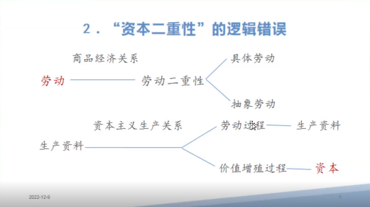 其次,张教授评析了新资本拜物教的理论支撑——“资本的二重性”。他认为“资本的二重性”是为遮蔽资本的社会属性,实为自然属性辩护的对于马克思“劳动二重性”的模仿。基于此,张教授阐明了“资本二重性”的逻辑错误,即把生产资料在资本主义生产中具有的二重属性,说成是作为二重属性中的一重的资本的属性,把外在于资本的事物说成是内在于资本属性。