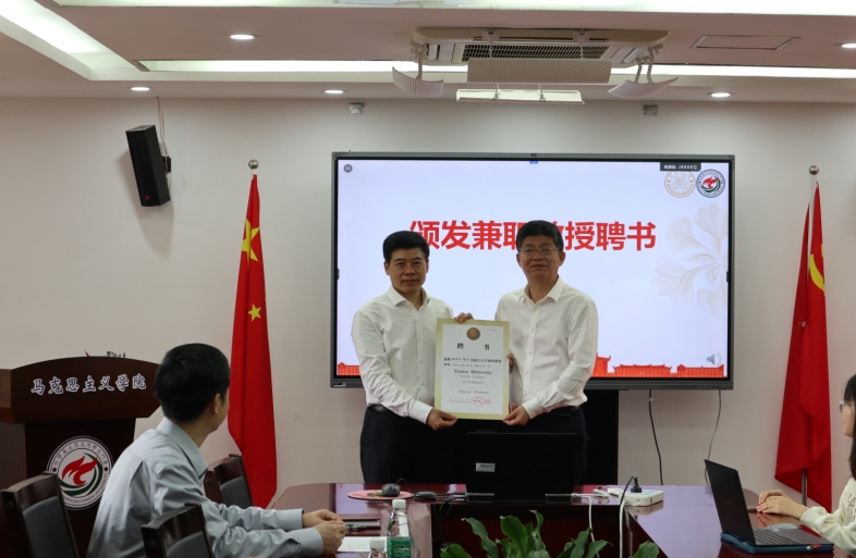 讲座开始之前,举行兼职教授敦聘仪式。由厦门大学党委副书记、马克思主义学院院长徐进功教授为倪邦文教授颁发聘任证书并合影留念。
