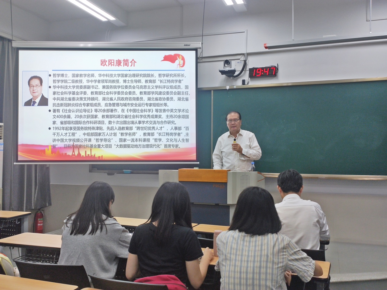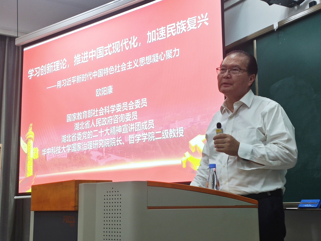 2023年11月2日,我院邀请华中科技大学国家治理研究院院长、哲学研究所所长、国家级教学名师欧阳康教授在南强二405教室开展主题为“学习创新理论,推进中国式现代化,加速民族复兴——用习近平新时代中国特色社会主义思想凝心聚力”的学术讲座。我院常务副院长张有奎教授主持讲座,学院部分硕博研究生积极参与了此次学习。