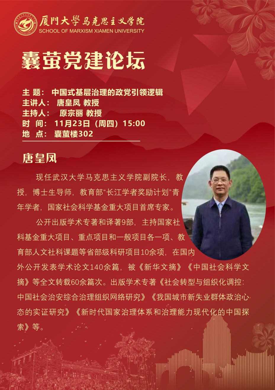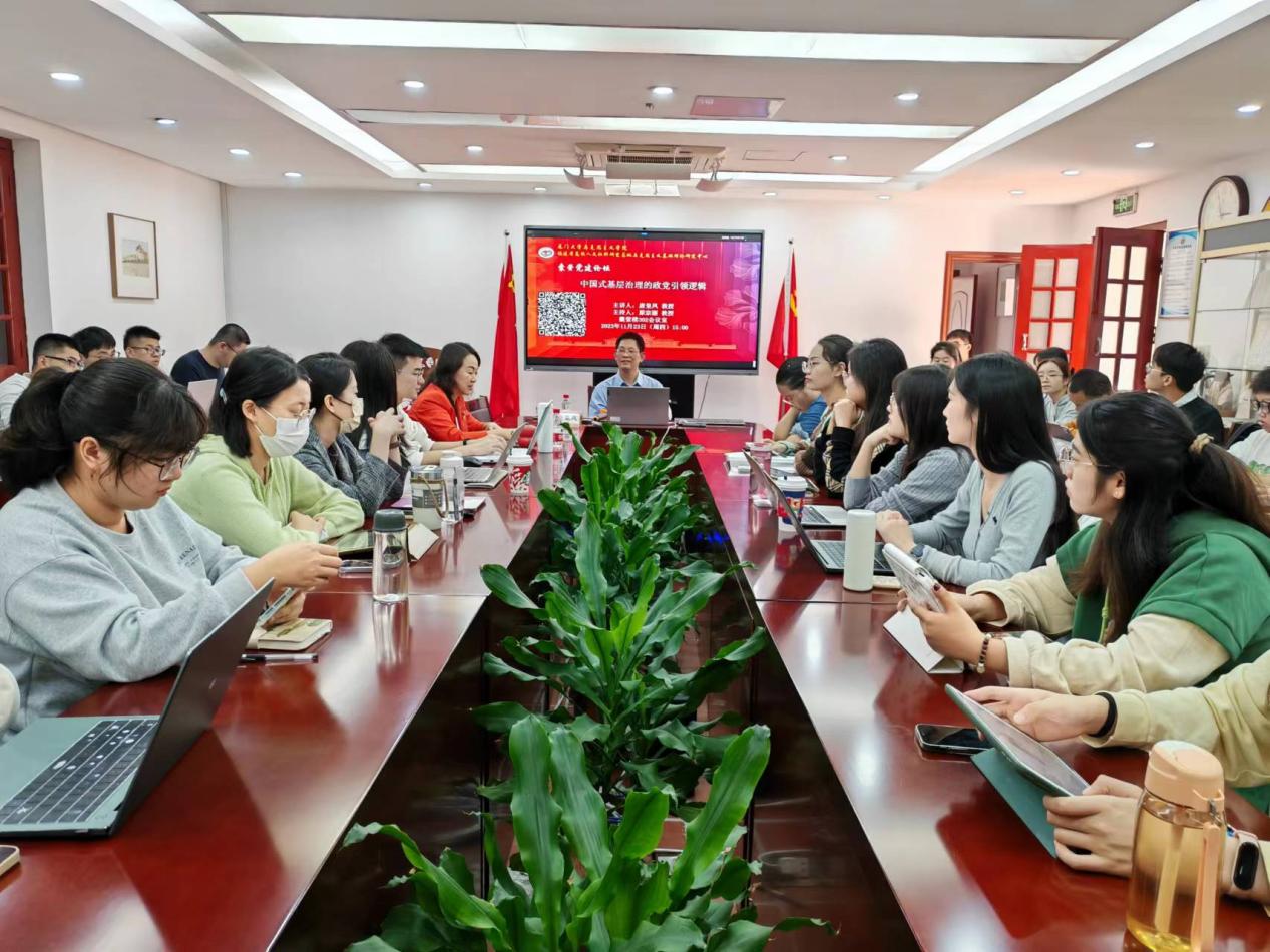 2023年11月23日下午,我院邀请到武汉大学马克思主义学院副院长、博士生导师,国家社会科学基金重大项目专家唐皇凤教授在囊萤楼302会议室作了题为《中国式基层治理的政党引领逻辑》的学术讲座。本次讲座由马克思主义学院党委副书记原宗丽教授主持,学院教师、硕博研究生积极参与了此次学习。