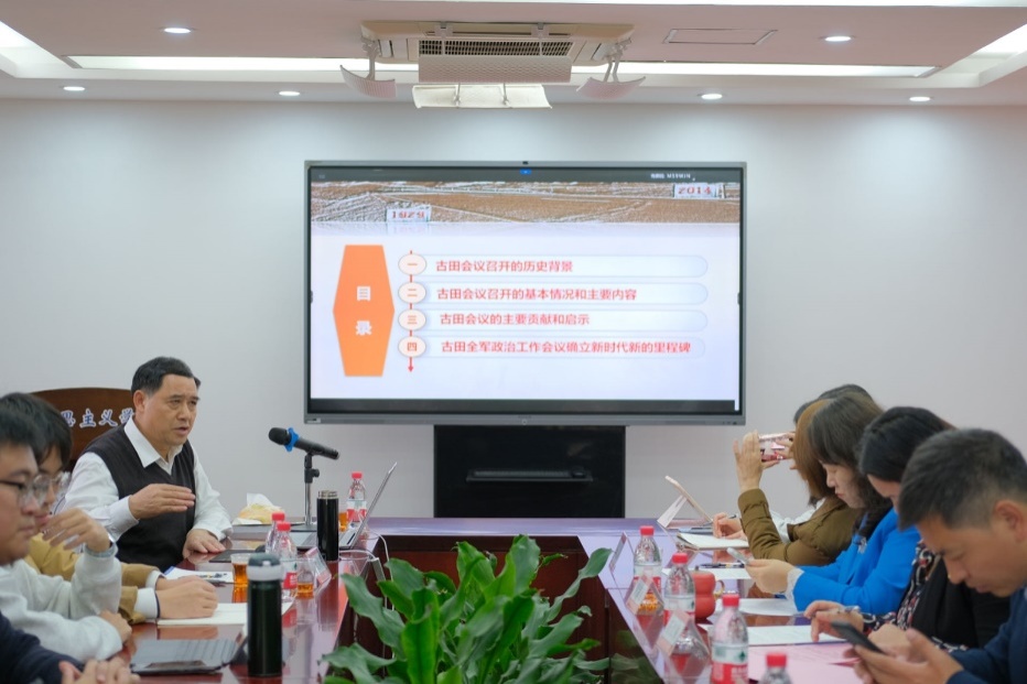 12月4日下午,我院邀请中共福建省委党校副校长、福建行政学院副院长、福建古田干部学院常务副院长曾汉辉教授作题为《古田会议——党和军队建设史上的里程碑》的学术讲座。本次讲座由马克思主义学院副院长原宗丽教授主持,学院党委书记石红梅教授、副书记刘晓峰、中国近现代史教研部主任周雪香教授等老师以及硕博研究生参加。