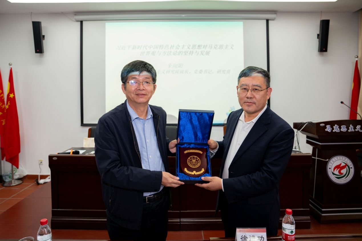 厦门大学党委副书记、马克思主义学院院长徐进功教授为辛向阳研究员颁授“南强学术讲座”纪念牌
