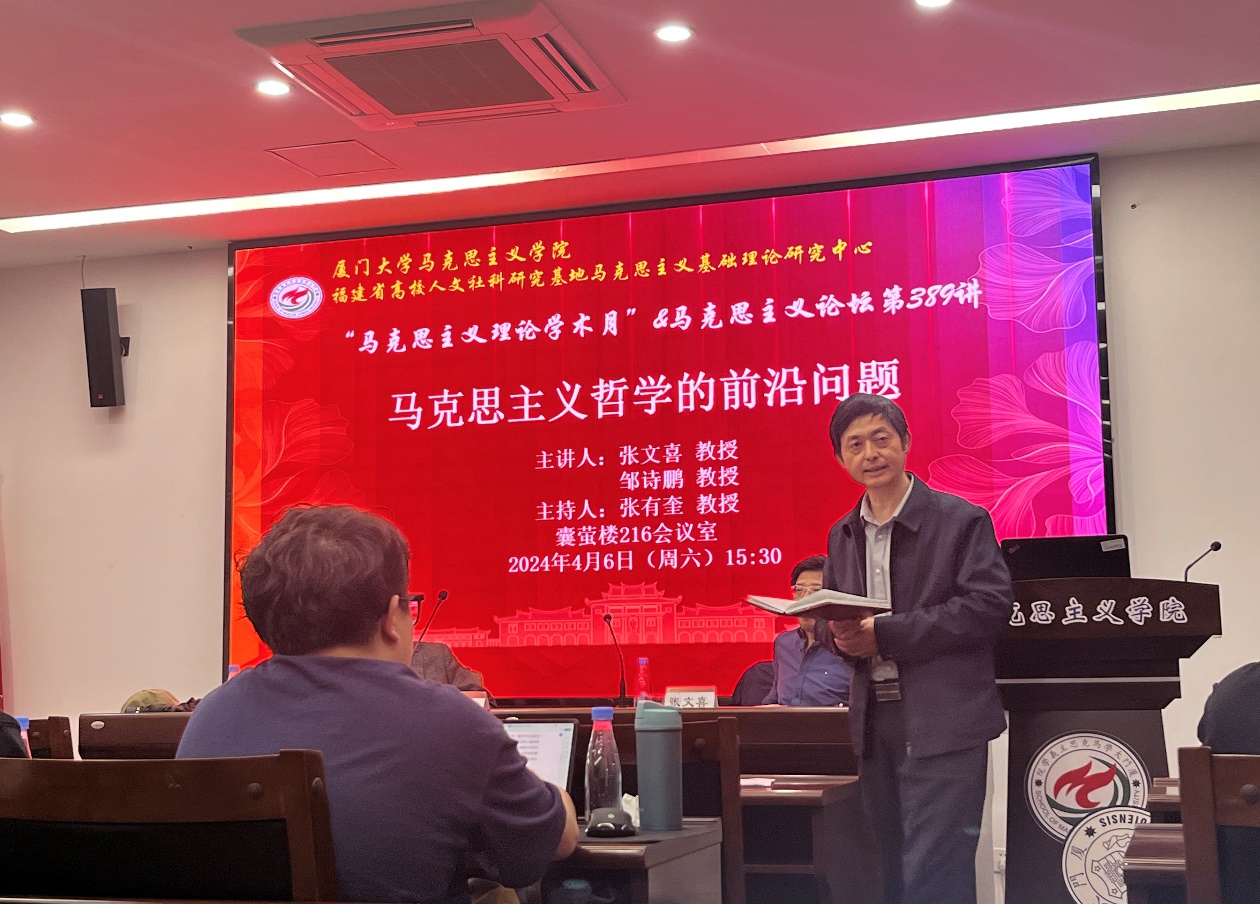 4月6日下午,马克思主义论坛第389讲在囊萤楼216会议室举行。“长江学者奖励计划”特聘教授、中国人民大学哲学院张文喜教授和“长江学者奖励计划”特聘教授、复旦大学哲学学院邹诗鹏教授应邀作题为《马克思主义哲学的前沿问题》的学术讲座。马克思主义学院常务副院长张有奎教授主持。