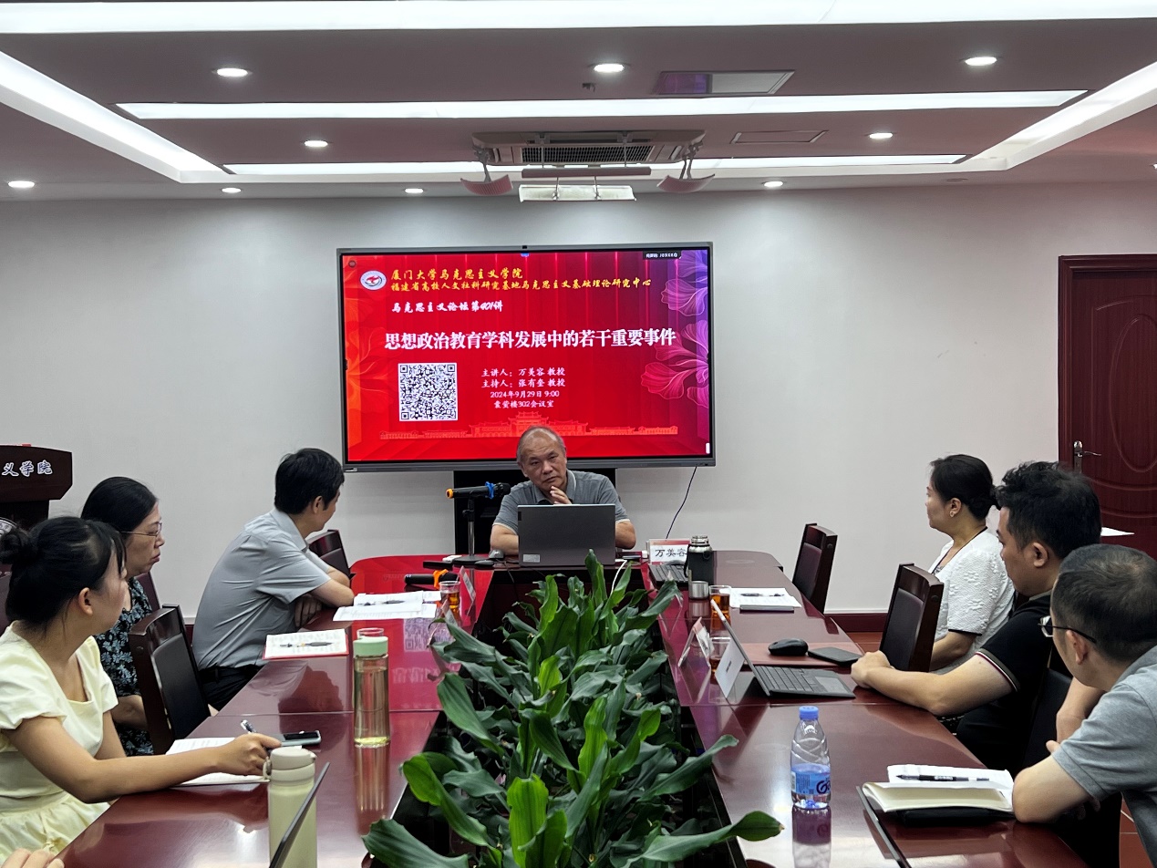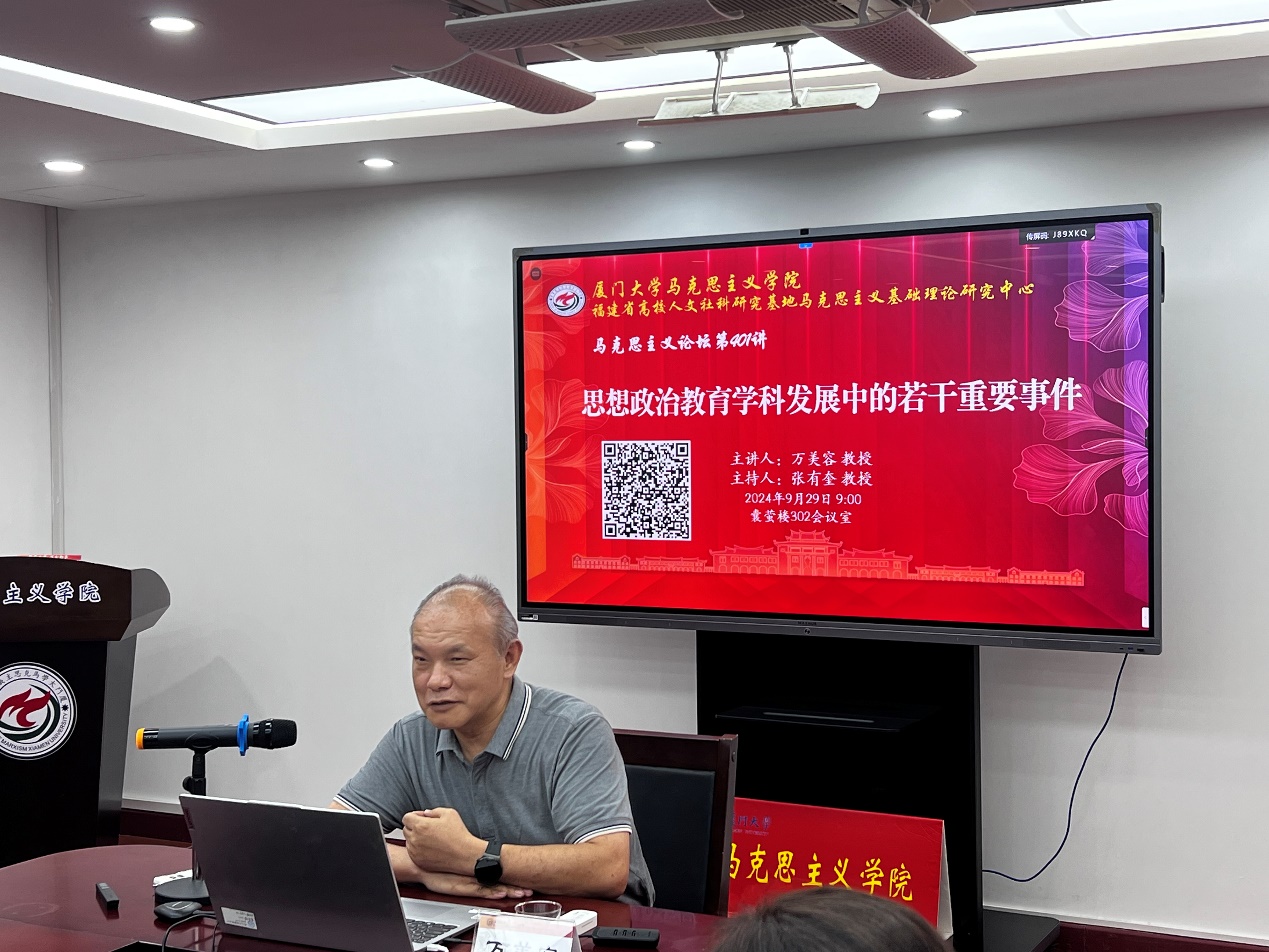 为深入学习贯彻全国教育大会精神,进一步凝聚思想共识、强化使命担当,2024年9月29日,厦门大学马克思主义学院举行了第401讲马克思主义论坛,邀请国务院学位委员会学科评议组成员、华中师范大学马克思主义学院博士生导师万美容教授,举行《思想政治教育学科发展中的若干重要事件》专题讲座。