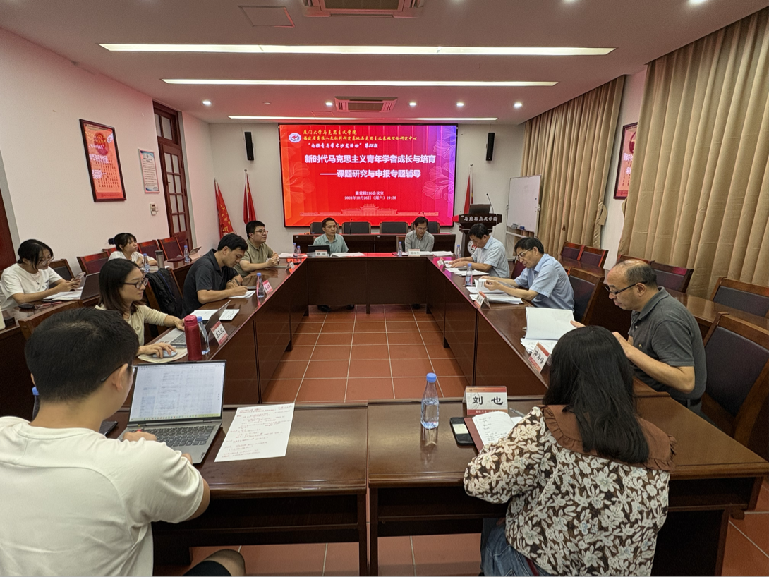 10月26日,厦门大学马克思主义学院“南强青马”学术沙龙活动第14期之“新时代马克思主义青年学者成长与培育——课题研究与申报专题辅导”在厦门大学囊萤楼216会议室顺利举办。北京大学马克思主义学院院长仰海峰教授、北京师范大学哲学学院教授沈湘平、山东师范大学马克思主义学院教授贾英健与深圳大学人文学院教授田启波作为特邀嘉宾进行了主题分享。本次学术沙龙活动由马克思主义学院副院长林密教授主持,马克思主义学院庄三红、傅志伟、刘也、陈仁锋等青年教师和部分硕博学生共同参与了此次的学习交流。