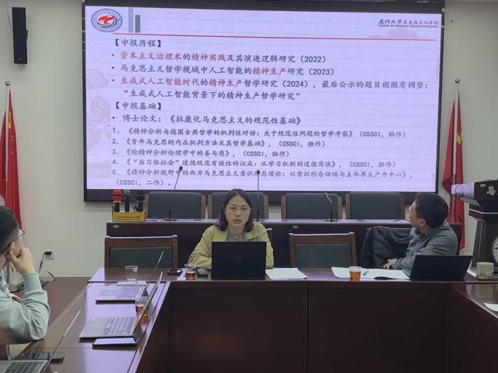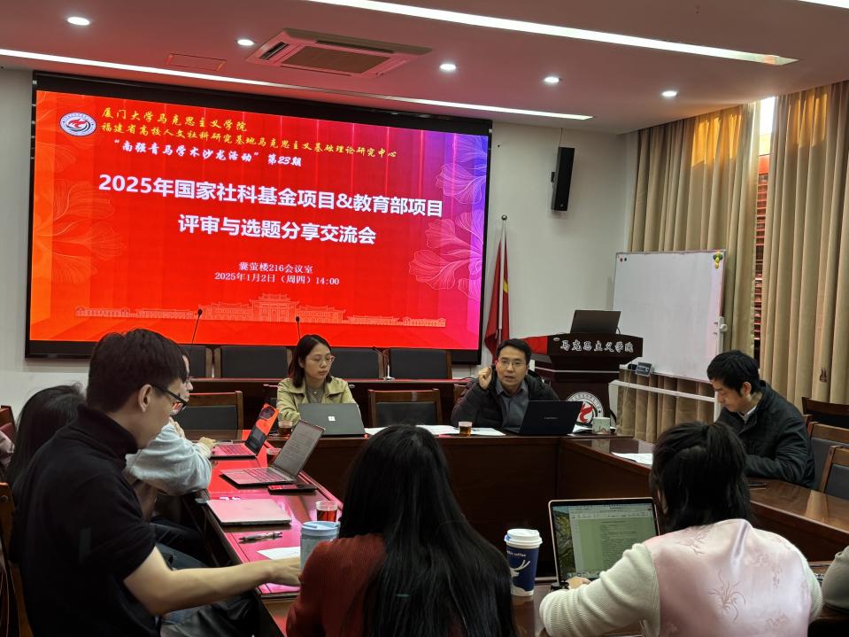 1月2日,厦门大学马克思主义学院“南强青马”学术沙龙活动第23期之“2025年国家社科基金项目&教育部项目评审与选题分享交流会”在厦门大学囊萤楼216会议室顺利举办。张有奎教授、林密教授、黄秋萍助理教授进行了主题分享,陈仁锋、肖盈、傅志伟、洪玲艳、王奇琦、谢素蓉、王小军等青年教师共同参与了此次的学习交流。