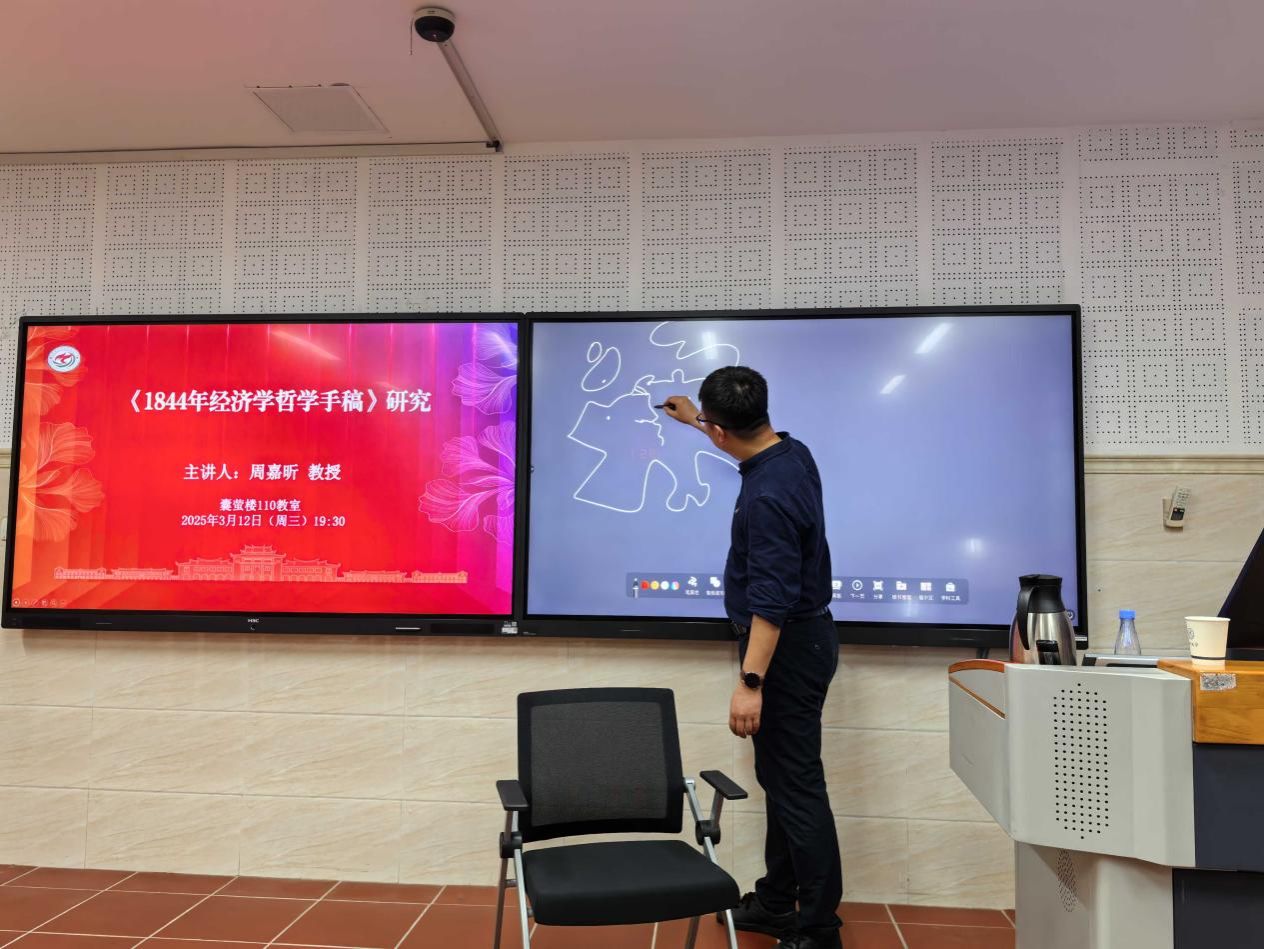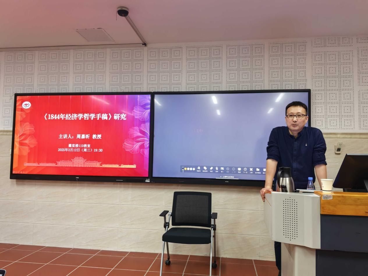 2025年3月11日,厦门大学马克思主义学院“马克思主义理论学术活动月”系列讲座暨“马克思主义论坛”第410讲在囊萤楼110教室顺利举行。本次论坛特邀南京大学哲学学院副院长、马克思主义社会理论研究中心教授周嘉昕担任主讲嘉宾,以“《1844年经济学哲学手稿》研究”为主题,为师生带来了一场兼具学术深度与思想启发的讲座。活动由学院教师陈铮主持,硕博研究生积极参与此次学习。