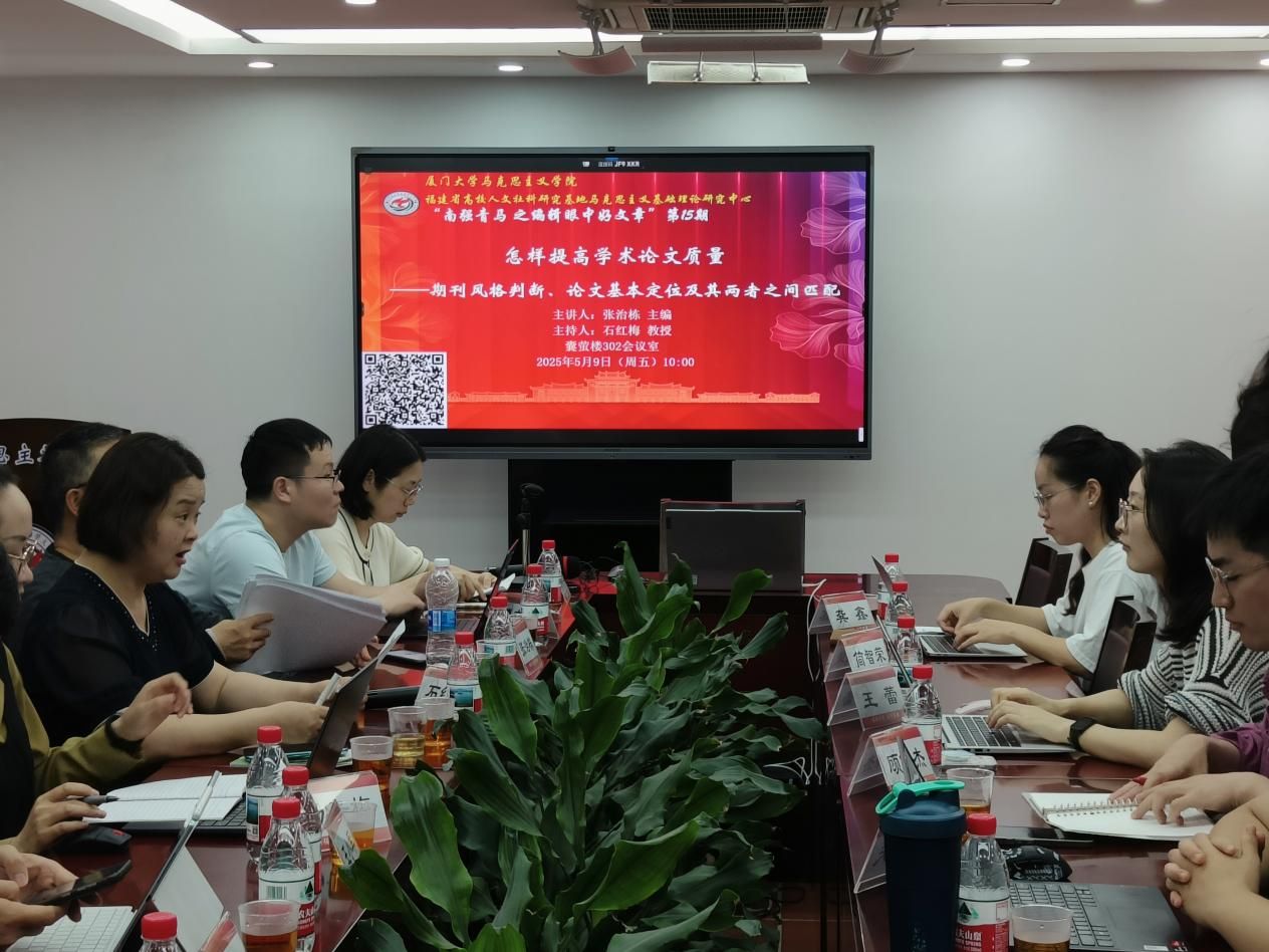 5月9日,厦门大学马克思主义学院“南强青马”系列之“编辑眼中的好文章”学术沙龙活动第15期在囊萤楼302会议室举办。本期活动以“怎样提高学术论文质量——期刊风格判断、论文基本定位及其两者之间匹配”为主题,特邀安徽大学教授、博导、《安徽大学学报(哲学社会科学版)》主编张治栋担任主讲嘉宾,共同探讨学术研究与青年人才培养路径。活动由学院党委书记石红梅教授主持,学院部分教师与硕博研究生参与学习交流。