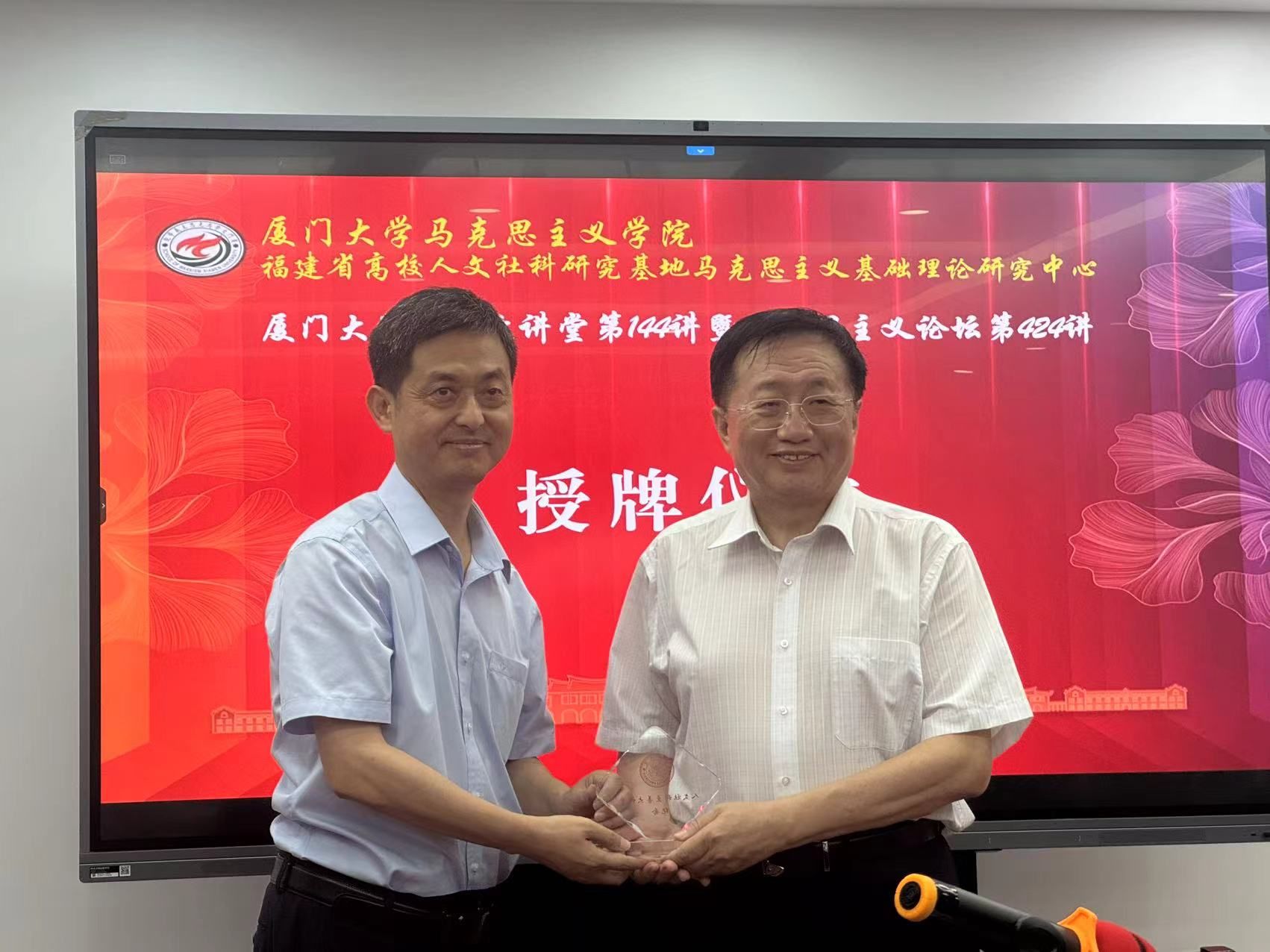 会前举行授牌仪式,马克思主义学院常务副院长张有奎向邴正教授颁授“人文社科至善大讲堂”纪念牌。
