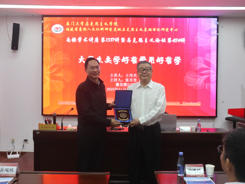 2025年11月4日上午,厦门大学南强学术讲座第1381讲暨马克思主义论坛第434讲在囊萤楼216会议室举行。第十三届全国政协常委、民族和宗教委员会主任,中国辩证唯物主义研究会会长,中国社会科学院原党组书记、院长王伟光教授以“大学生要学好哲学用好哲学”为题,为我校师生带来一场兼具思想高度和理论深度的学术讲座。厦门大学副校长吴超鹏教授为王伟光教授颁授“南强学术讲座”纪念牌。厦门大学马克思主义学院常务副院长张有奎教授主持授牌仪式和讲座,学院院长徐进功教授、副院长刘皓琰教授及部分师生莅会学习。