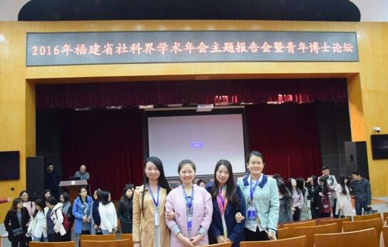 12月10日,由福建省社科联主办的福建省社会科学界2016年学术年会主题报告会暨青年博士论坛在福州大学举行。我院博士研究生华苗、朱婷婷、马丽、程圆圆应邀参加了当天的主题报告会。