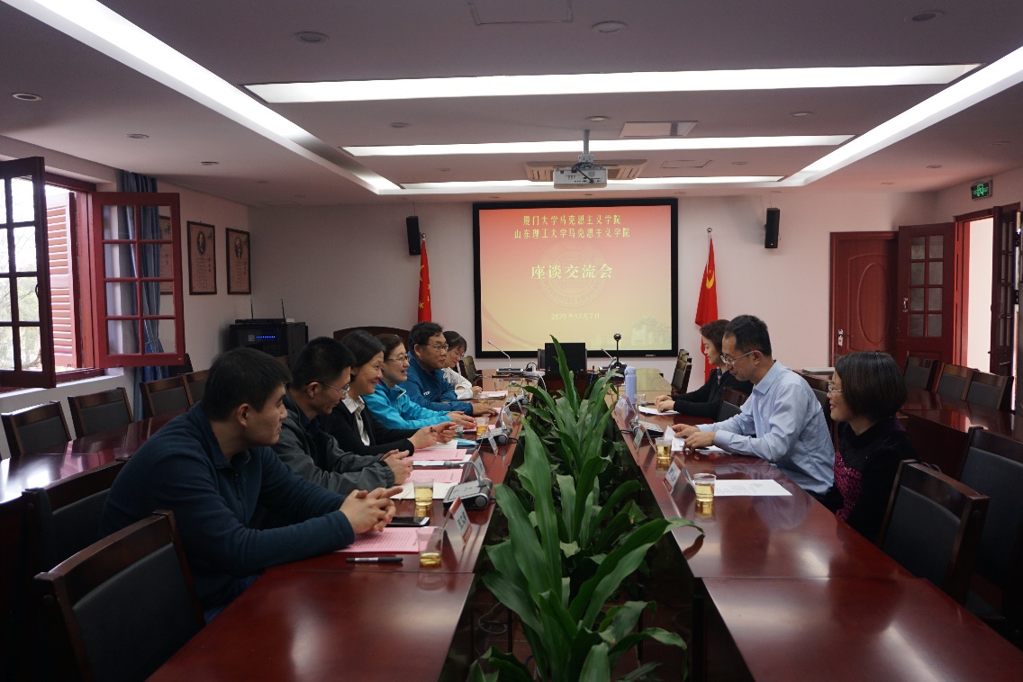张艳涛副院长首先对张慎霞主任一行的到访表示欢迎,接着介绍了厦门大学马克思主义学院的基本情况,就教学、科研、学科建设及社会服务等内容与来访老师进行交流。山东理工大学的张慎霞主任介绍了此行的目的,就关心的教学改革、实践教学、课程设置、学科评估提出了一系列的问题。交流过程中,石红梅教授着重了介绍了学院开展的实践教学和教学改革情况,周雪香教授就对方关心的学院教授委员会的相关情况进行了介绍。