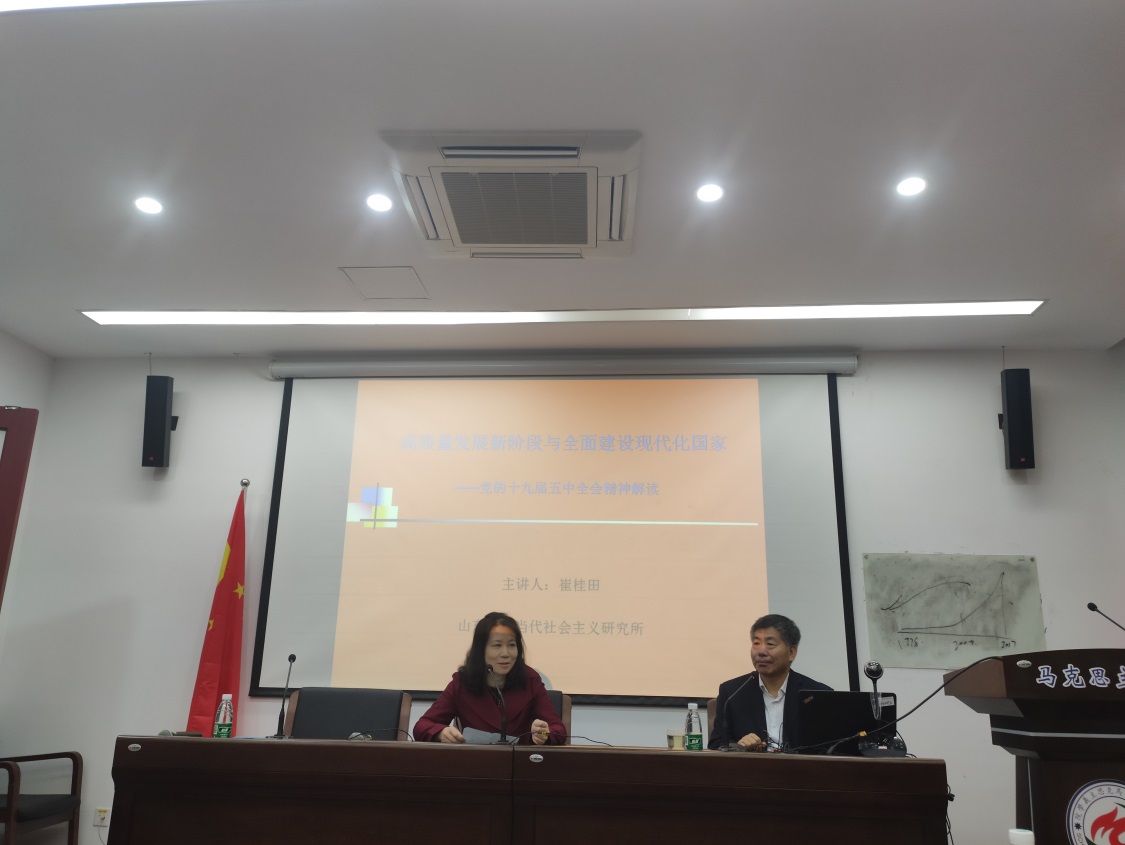 为深入学习贯彻党的十九届五中全会精神,12月7日上午,我院邀请山东大学政治学与公共管理学院崔桂田教授在囊萤楼216报告厅做题为“高质量发展新阶段与全面建设社会主义现代化国家”的学术讲座。本次讲座由马克思主义中国化教研部冯霞教授主持,我院部分教师和硕博士生参加了讲座。