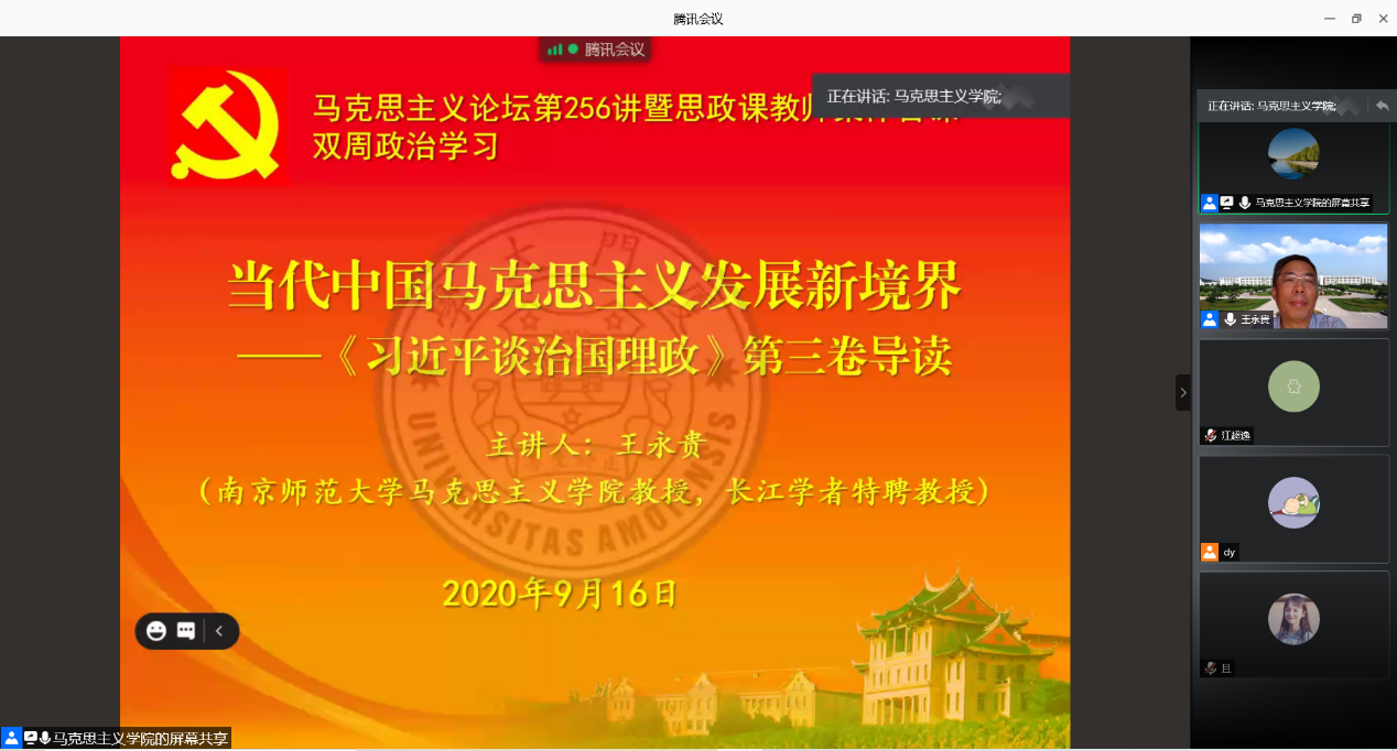 9月16日上午,我院邀请教育部“长江学者”特聘教授、南京师范大学马克思主义学院王永贵教授在囊萤楼313做了题为“当代中国马克思主义发展新境界——《习近平谈治国理政》第三卷导读”的讲座。校党委常委、宣传部部长、马克思主义学院院长徐进功教授主持讲座。