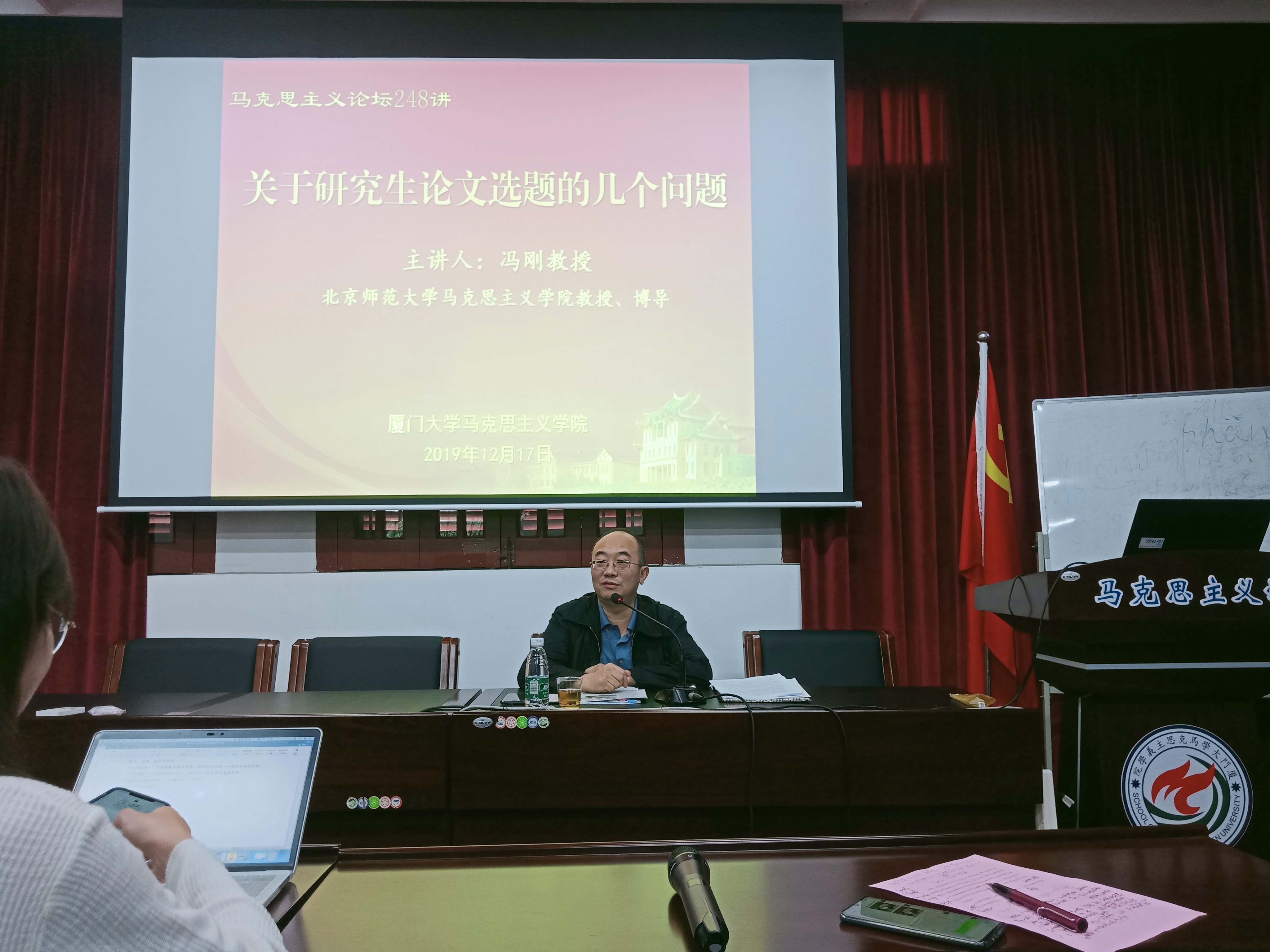 12月17日,我院邀请北京师范大学马克思主义学院教授、博导冯刚老师在同安楼201报告厅作题为“关于研究生论文选题的几个问题”的专题讲座。我院副院长张艳涛老师、林密老师和王奇琦老师以及2019级全体硕博学生参加了此次讲座。本场讲座由张艳涛主持。