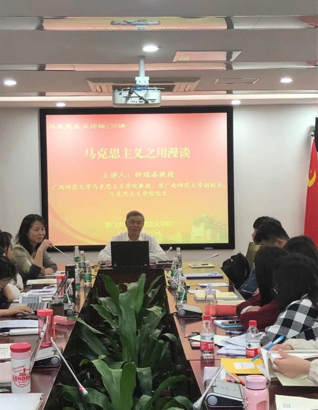 2019年11月19日下午我院特邀广西师范大学前副校长、马克思主义学院院长钟瑞添教授,在囊萤楼216会议室作题为“马克思主义之用漫谈”的精彩讲座。马克思主义学院中国化教研部冯霞教授主持。马克思主义中国化研究教研部相关教师及其他教研部的教师代表、2019级硕博生参加了此次讲座。