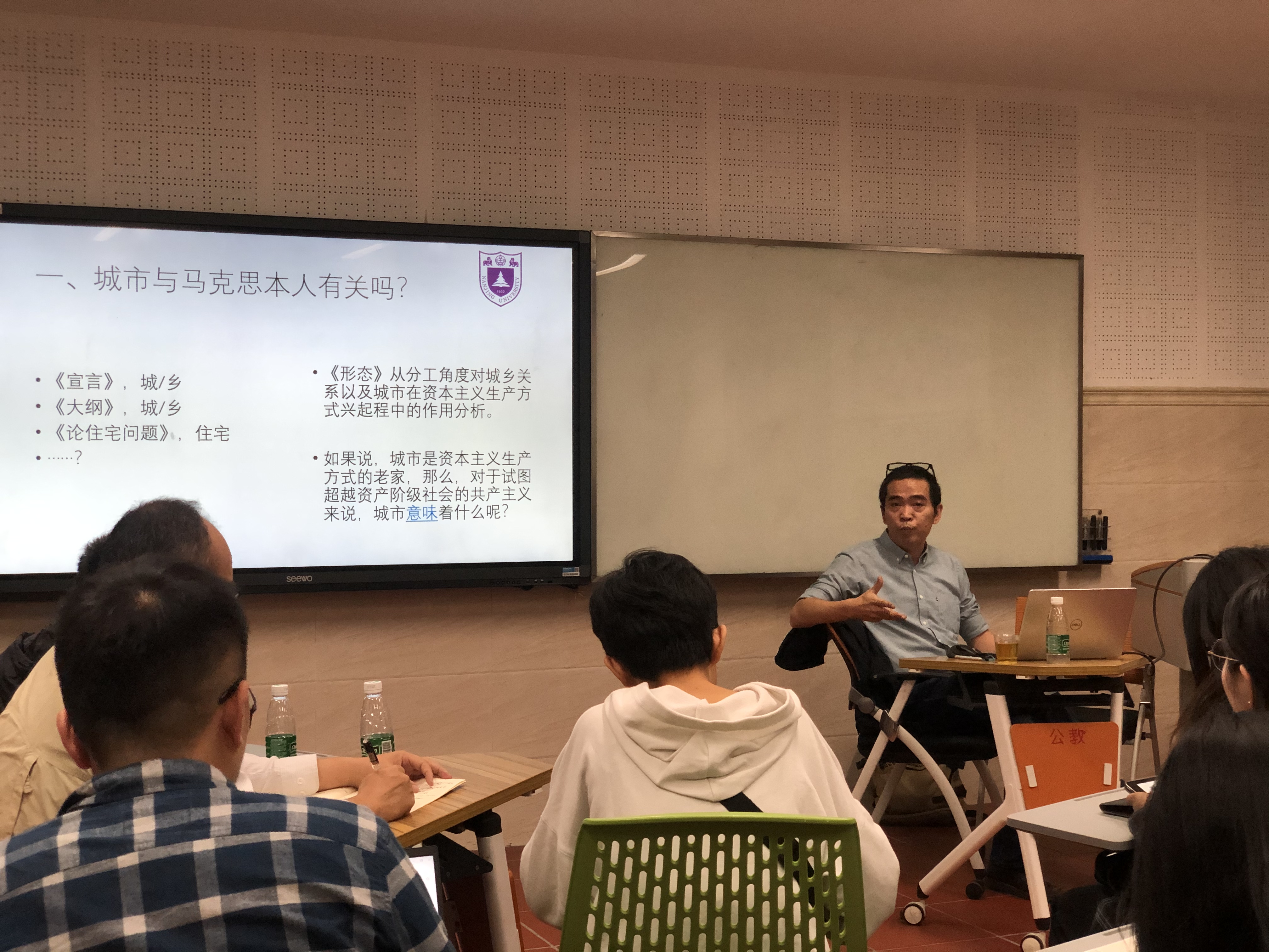 讲座伊始,张有奎老师代表学院对胡大平教授的到来表示欢迎。胡教授首先通过解读马克思经典文本中城乡关系的论述,为我们展现了在现代资本主义产生之前,马克思对待城市的看法。接着,胡教授分析了本雅明文本的内容,结合生活中的例子,强调应要将日常生活的内容作为学术研究的素材之一。最后,胡教授认为,在今日城市语境中,研究城市要实现从复杂性到有机性,从想象城市到行走城市。